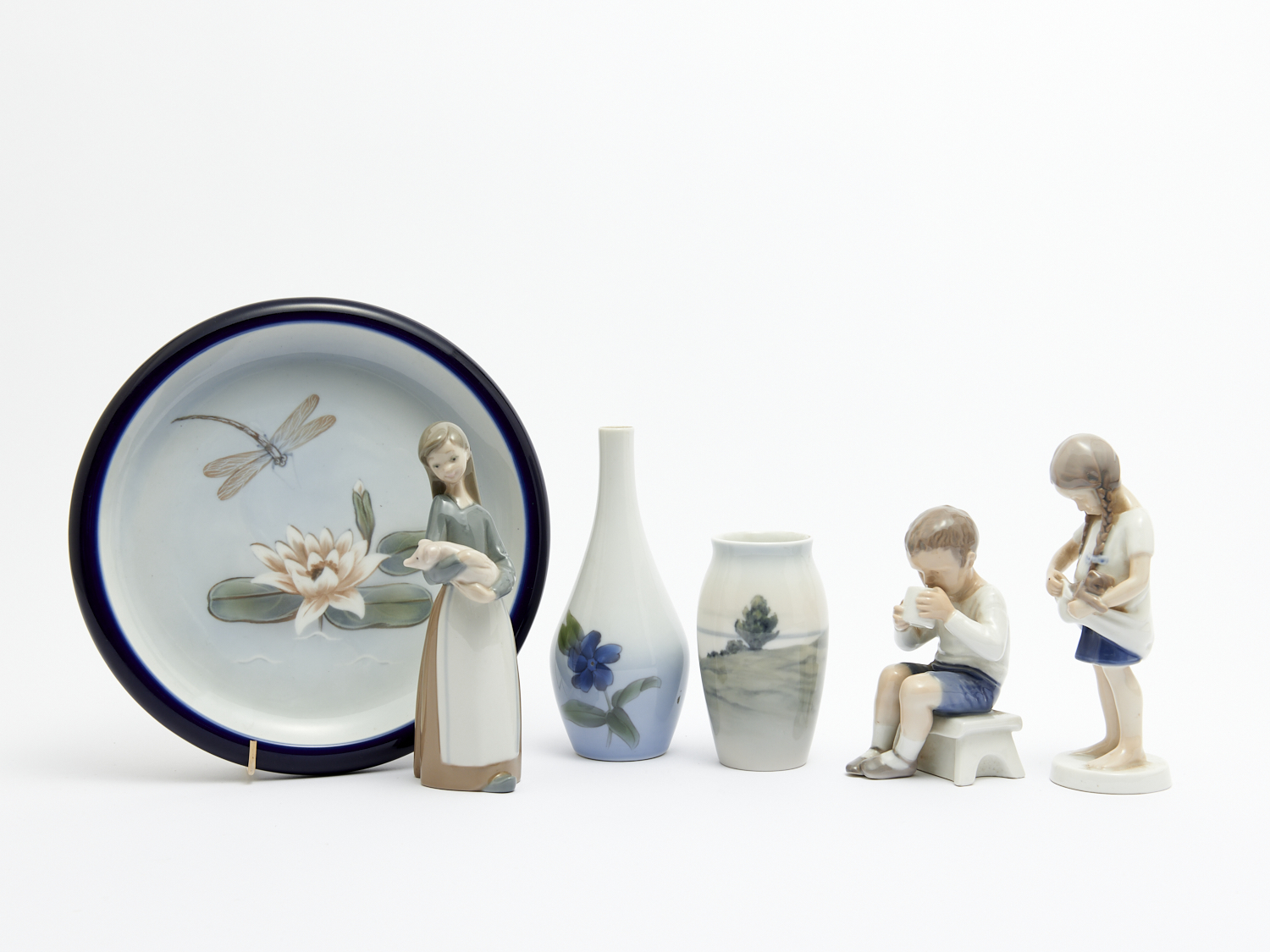 FIVE PIECES OF DANISH PORCELAIN INCL. FIGURES TOGETHER WITH A LLADRO FIGURE DIA.24CM (LARGEST), LEONARD JOEL LOCAL DELIVERY: MEDIUM