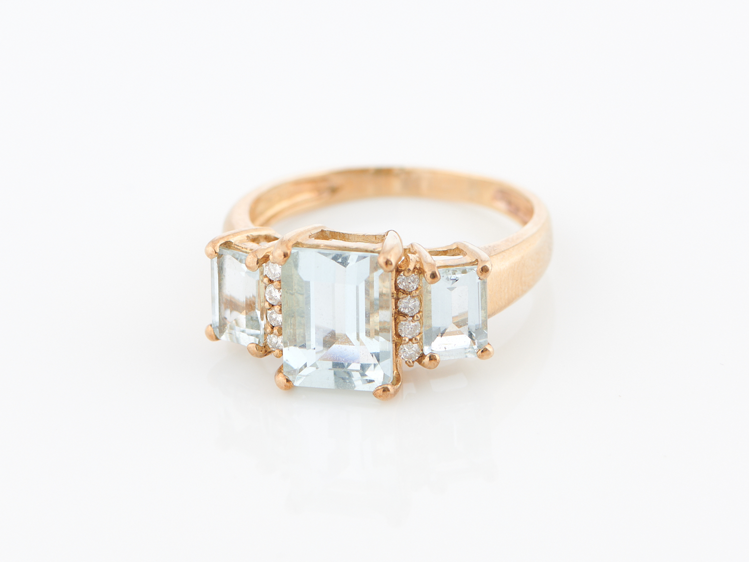AN AQUAMARINE AND DIAMOND DRESS RING IN 9CT GOLD, SIZE P, 3.4GMS