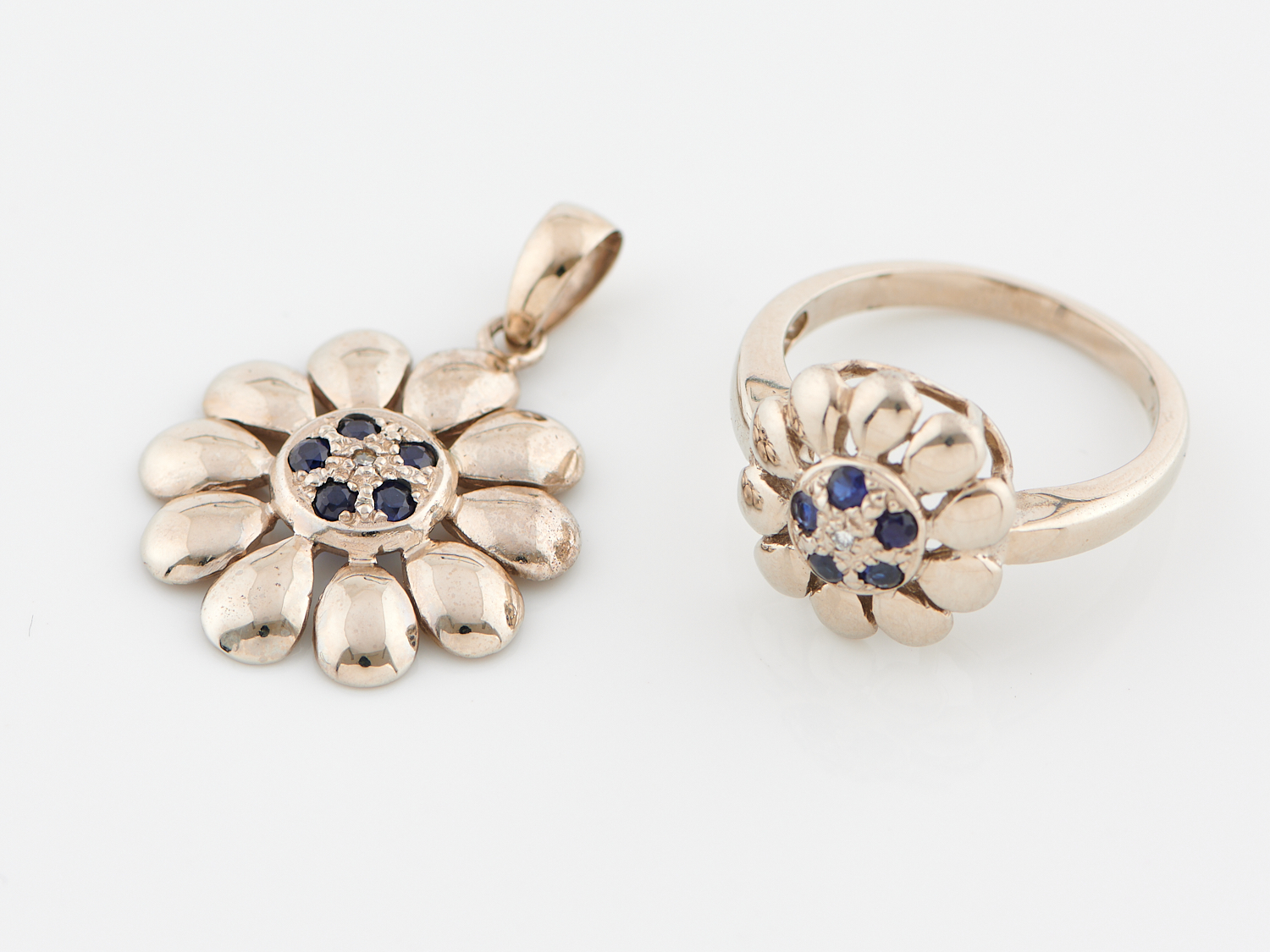 A SAPPHIRE AND DIAMOND JEWELLERY SUITE IN 9CT WHITE GOLD, INCLDUING A PENDANT AND RING, SIZE O