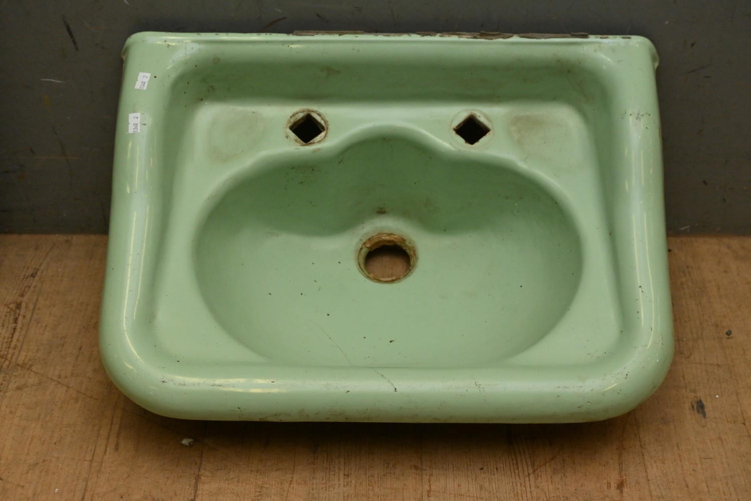 A 1940S GREEN ENAMELLED SINK (28H X 56W X 41D CM) (PLEASE NOTE THIS HEAVY ITEM MUST BE REMOVED BY CARRIERS AT THE CUSTOMER'S EXPENSE. LEONARD JOEL STAFF CANNOT ASSIST CARRYING THIS ITEM) (X-LARGE ITEM)