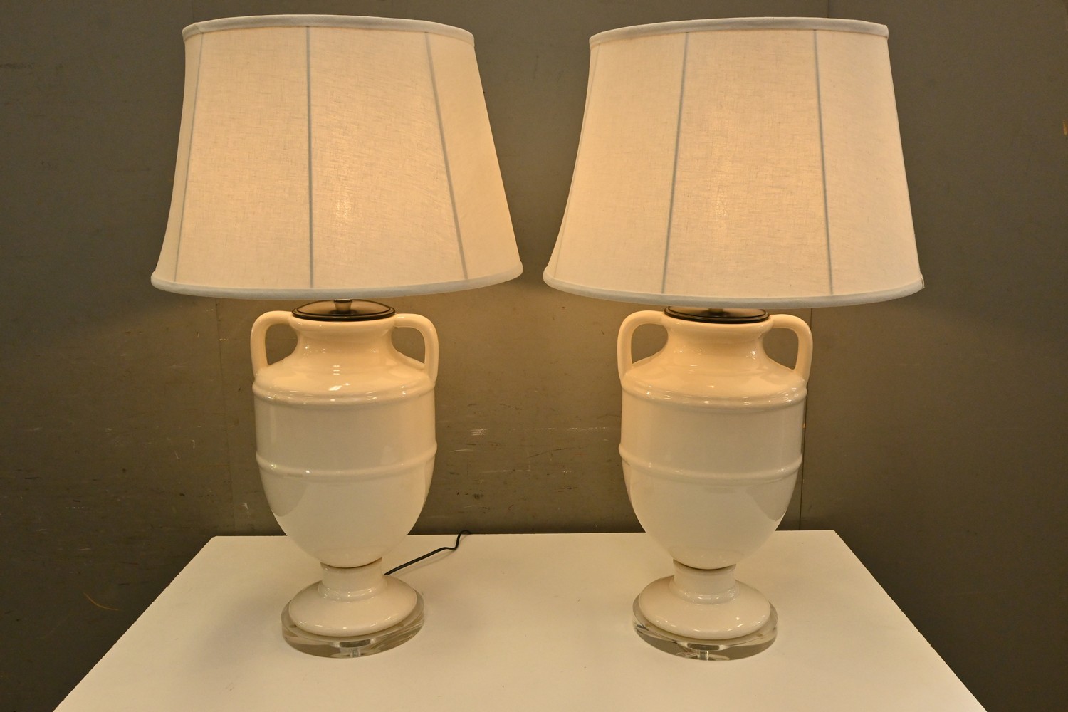 A PAIR OF CERAMIC CLASSICAL STYLE TABLE LAMPS WITH CRACKLE EFFECT ( 88H X 50 DIAMETER CM) (LEONARD JOEL DELIVERY SIZE: LARGE)