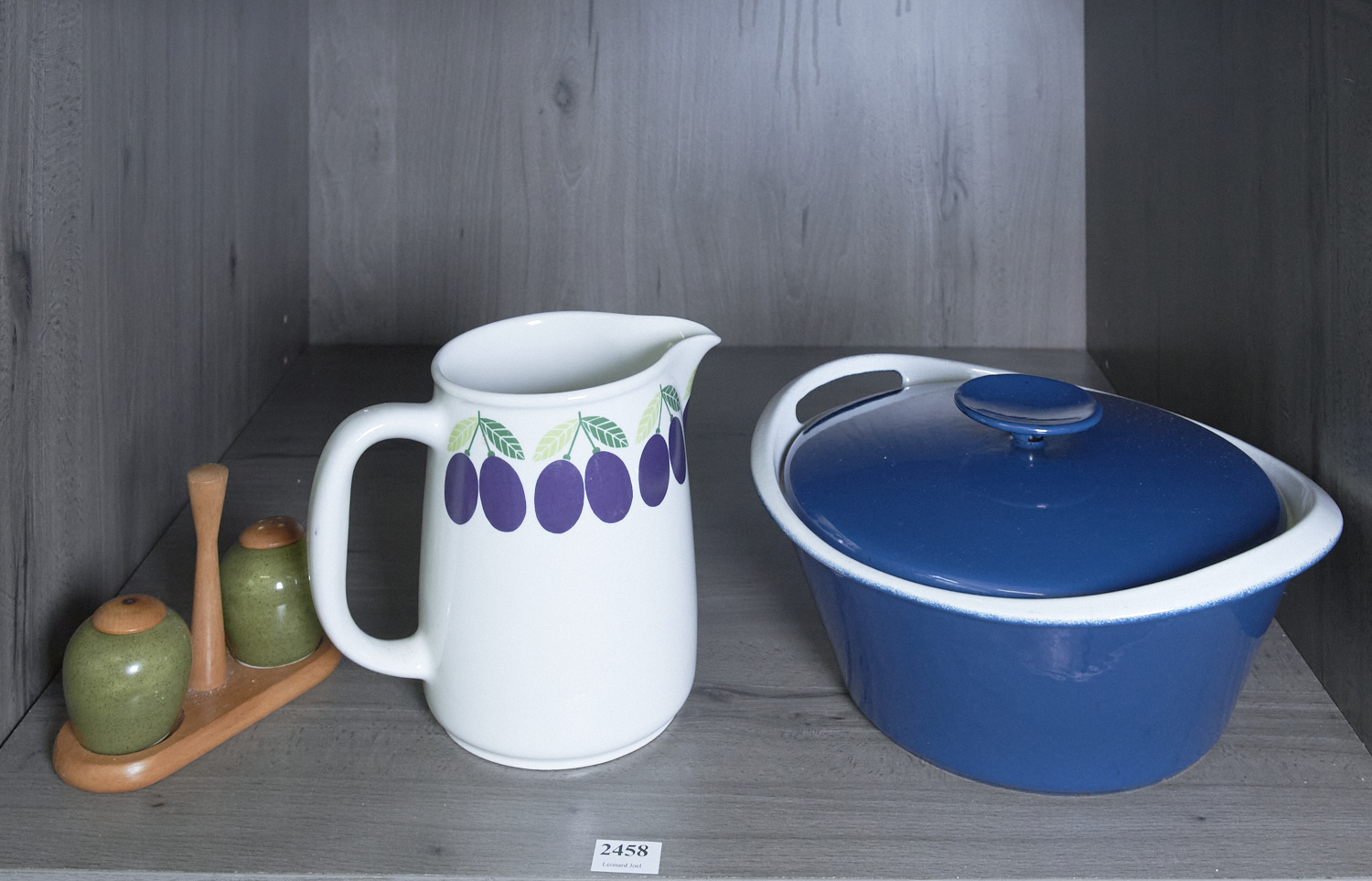 A SCANDINAVIAN LOT, WITH LARGE ARABIA PLUM JUG (FINLAND), A LIDDED ENAMEL COPCO POT (DENMARK), AND A CERAMIC AND TEAK CRUET SET (SWEDEN), LEONARD JOEL LOCAL DELIVERY: MEDIUM
