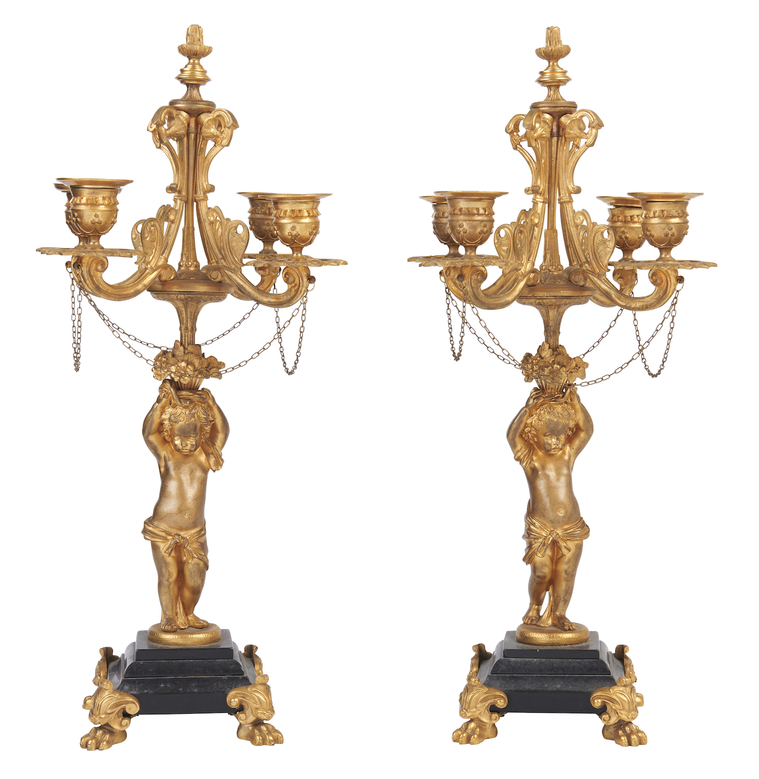 Each of four lights on scrolling branches raised above a figure of a putto standing on a black marble plinth with paw feet