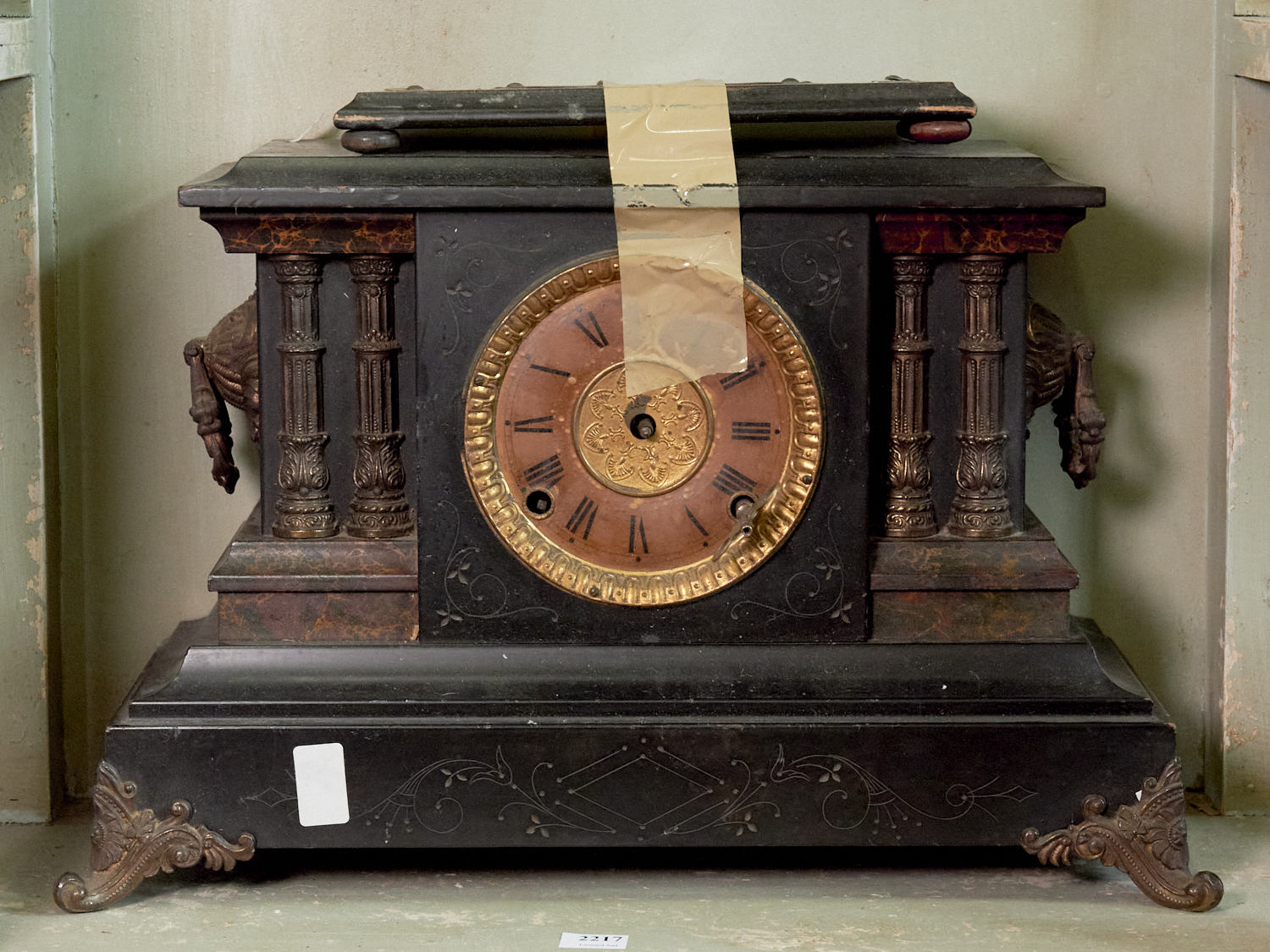 A WOODEN PAINTED MANTEL CLOCK H.31 X W.41.5CM (A/F), LEONARD JOEL LOCAL DELIVERY: MEDIUM