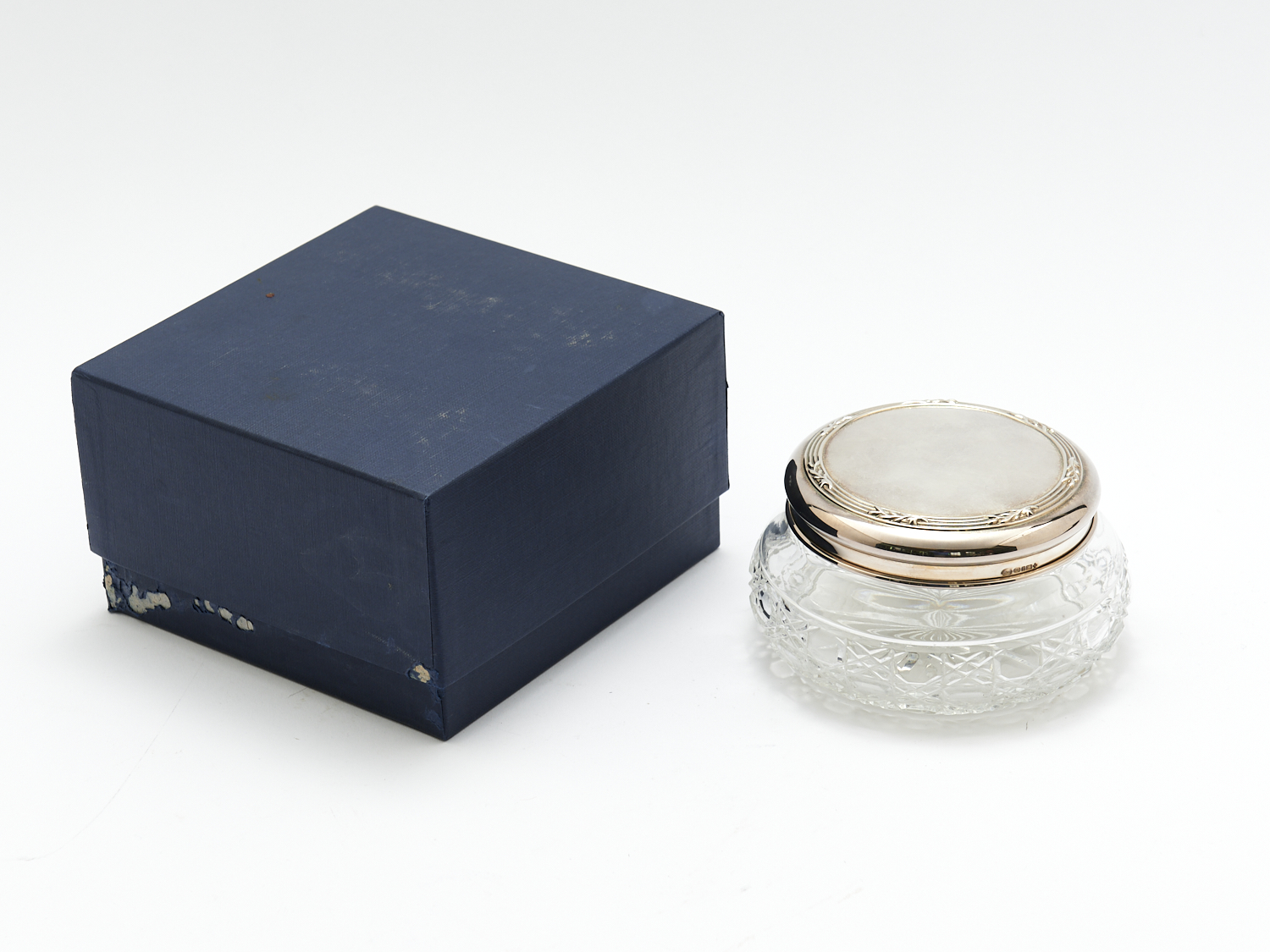 A STERLING SILVER TOPPED CRYSTAL JAR DIA.12CM, LEONARD JOEL LOCAL DELIVERY: SMALL