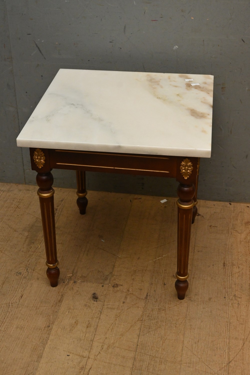 A LOUIS XVI STYLE MARBLE TOP SIDE TABLE (A/F) (45H X 44W X 44D CM) (LEONARD JOEL DELIVERY SIZE: LARGE)