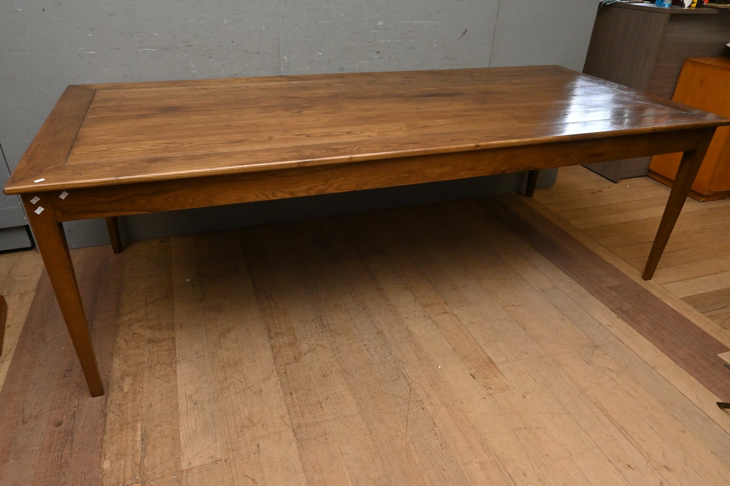 A FRENCH STYLE OAK TAPER LEG TABLE (H76 X W242 X D106 CM) (PLEASE NOTE THIS HEAVY ITEM MUST BE REMOVED BY CARRIERS AT THE CUSTOMER'S EXPENSE. LEONARD JOEL STAFF CANNOT ASSIST CARRYING THIS ITEM) (X-LARGE ITEM)