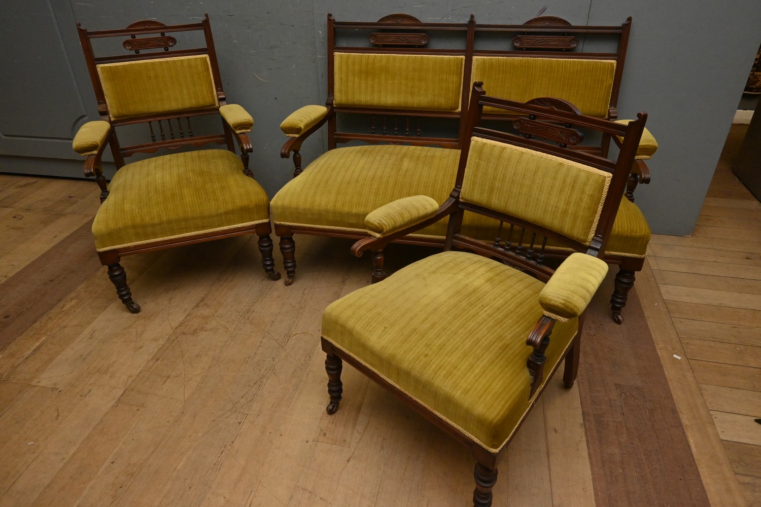 AN EDWARDIAN THREE PIECE UPHOLSTERED LOUNGE SUITE (A/F) (93H X 131W X 70D CM) (LEONARD JOEL DELIVERY SIZE: X-LARGE)
