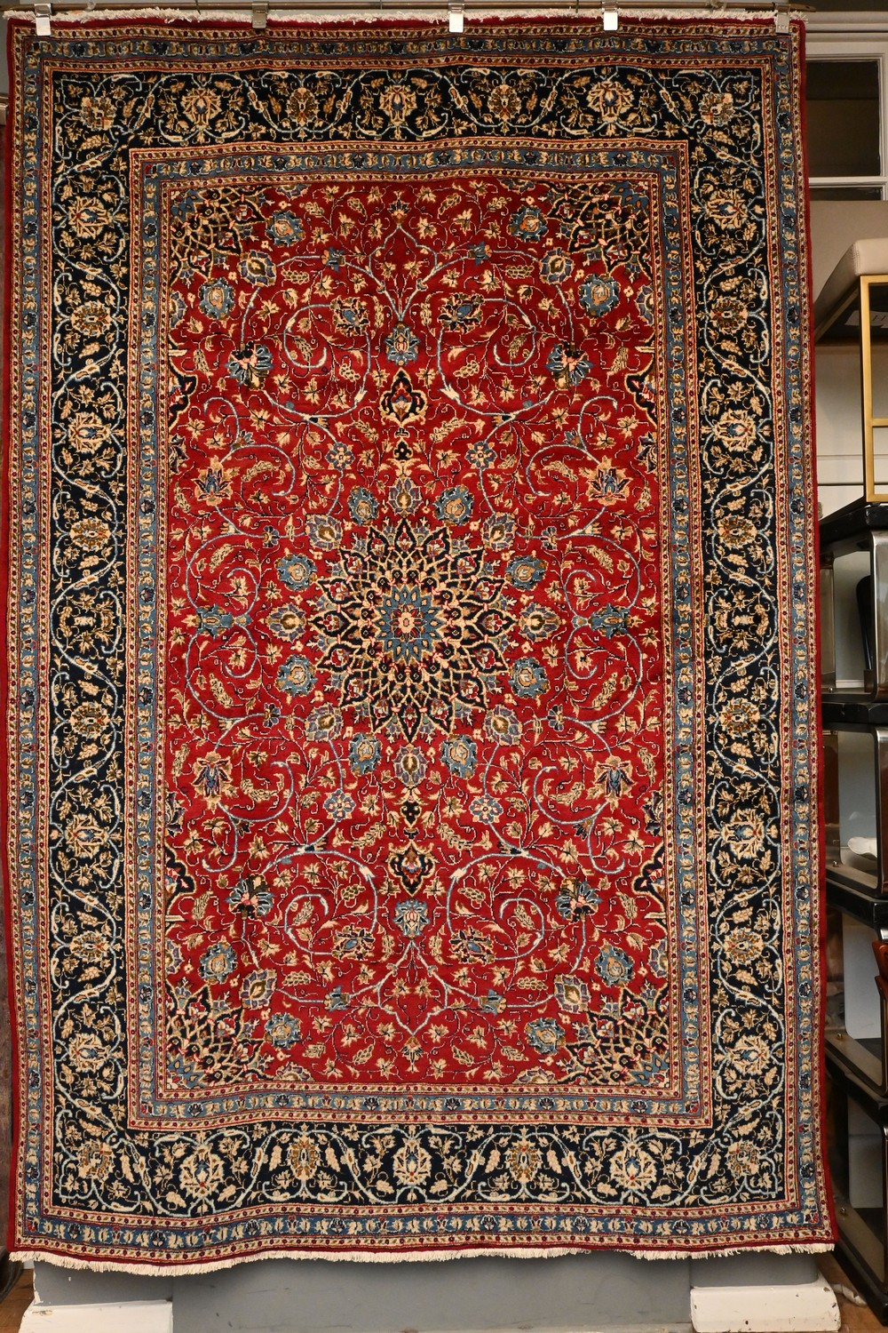 A TRADITIONAL PERSIAN KASHMAR CARPET. DENSLEY HANDKNOTTED WITH 100% SOFT WOOLEN PILE. CONTAINING A DETAILED 16 POINT ELOBED SUNBURST MEDALLION IN TONES OF FRENCH BLUE, CHAMPAGNE AND INDIGO BLUE. THE RICH CRIMSON FIELD IS HIGH LIGHTED WITH AND ESLIMI ISFAHANI MOTIF FRAMED IN A DEEP PERSIAN INDIGO BLUE THROUGHOUT WITH ROSSETS. SIZE: 294 X 208 CM. ORIGIN: PERSIA. RRP: $4,200.DOCUMENTATION OF AUTHENTICITY INCLUDED.
