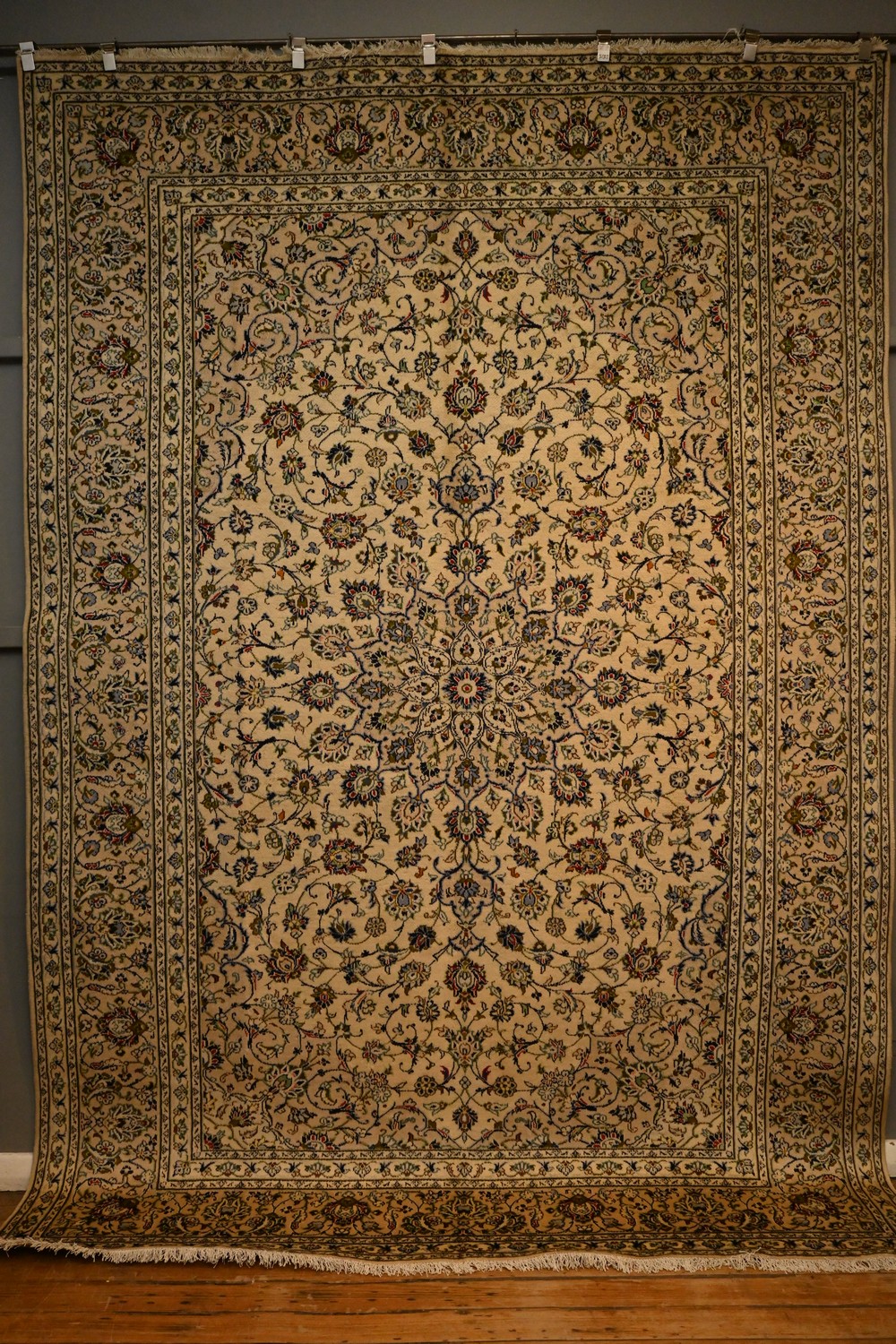 A LARGE AND TRADITIONAL PERSIAN KASHAN CARPET. HANDKNOTTED WITH 100% DENSE WOOLEN PILE COMPRISING OF A VIBRANT DOUBLE CHANDELIER MEDALLION ON A FIELD OF ROSE GARDEN MOTIFS IN TONES OF IVORY, LIGHT BLUE, GREEN WITH HIGHLIGHTS OF RUBY RED. SIZE: 345X 240 CM ORIGIN: IRAN. DOCUMENTATION OF AUTHENTICITY INCLUDED. RRP - $4200.