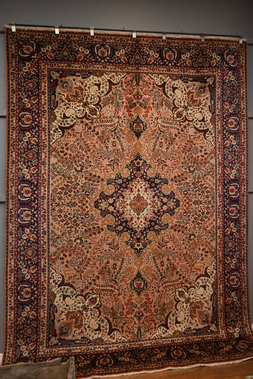 A PERSIAN TABRIZ CARPET, HANDKNOTTED WITH FINEST WOOL IN THE MOST COMPLEX AND DETAIL DESIGN FEATURING A VERY DECORATIVE CORAL GROUND TONE AND FRAMED WITH A VIBRANT PERSIAN INDIGO BORDER. THIS SPECIAL EXAMPLE IS EXTREMLEY COLOURFUL CARRYING AN UNUSUAL OVAL MULTI ANCHORED MEDALLION SURROUNDED WITH A DANCING FLOWERS MOTIFS. SIZE: 345 X 248 CM ORIGIN: IRAN. RRP - $7,500 DOCUMENTATION OF AUTHENTICITY INCLUDED.