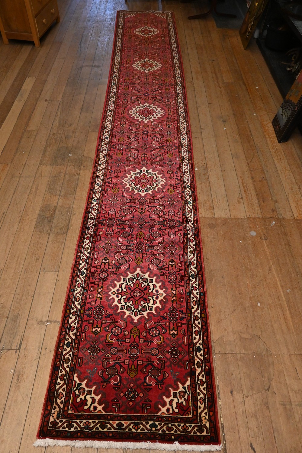 AN EXTRA LONG SOLID PERSIAN HOSSEINABAD HALL RUNNER, DENSLEY HAND KNOTTED WITH 100% WOOLEN PILE WITH AN ALLOVER HERATI MOTIFS. SIZE: 505 X 82 CM ORIGIN: PERSIA. RRP - $3800. DOCUMENTATION OF AUTHENTICITY INCLUDED.