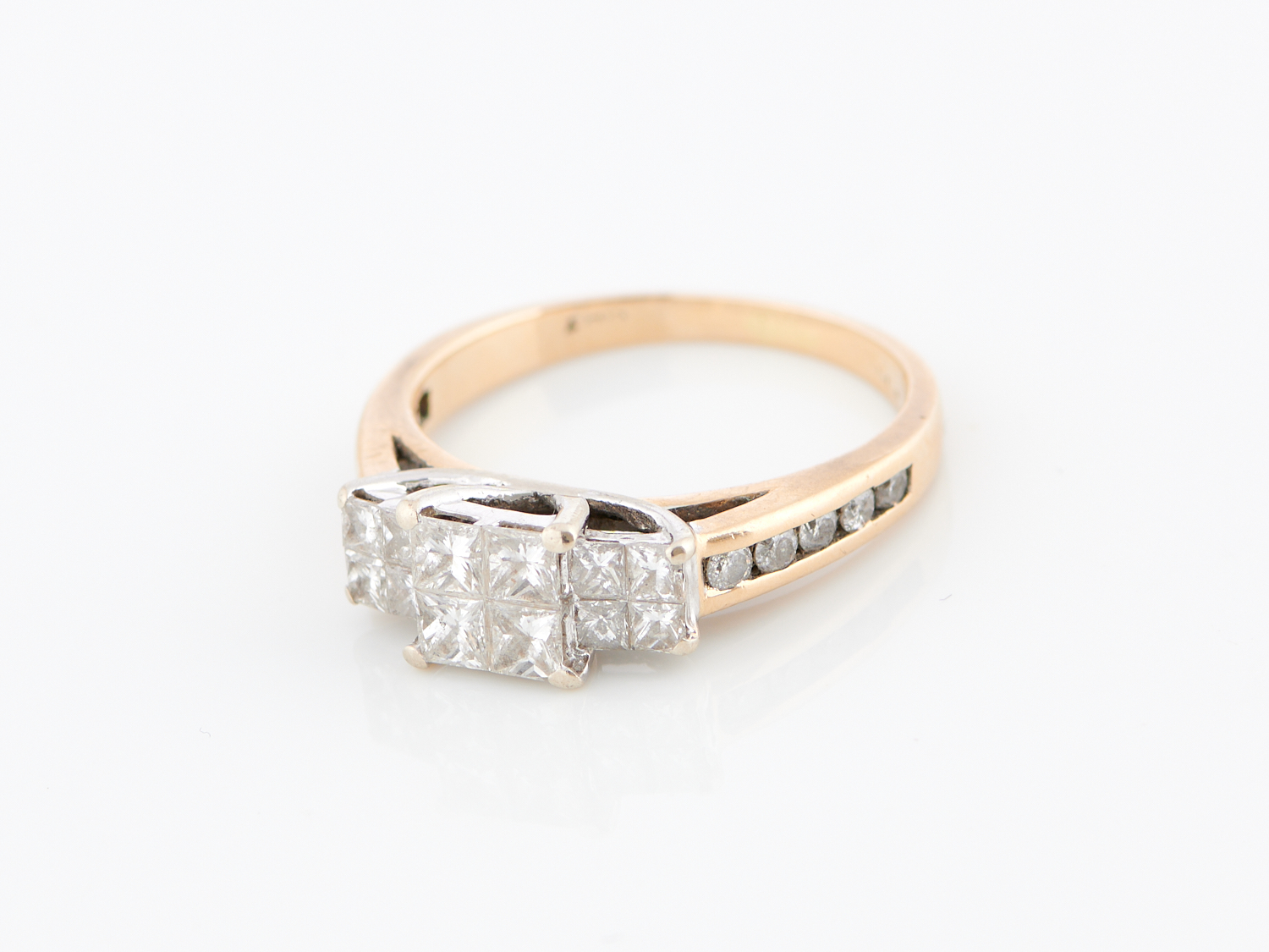 AN ILLUSION SET DIAMOND CLUSTER RING IN TWO TONE 14CT GOLD BY MICHAEL HILL, RING SIZE L, ACCOMPANIED BY PAPERS