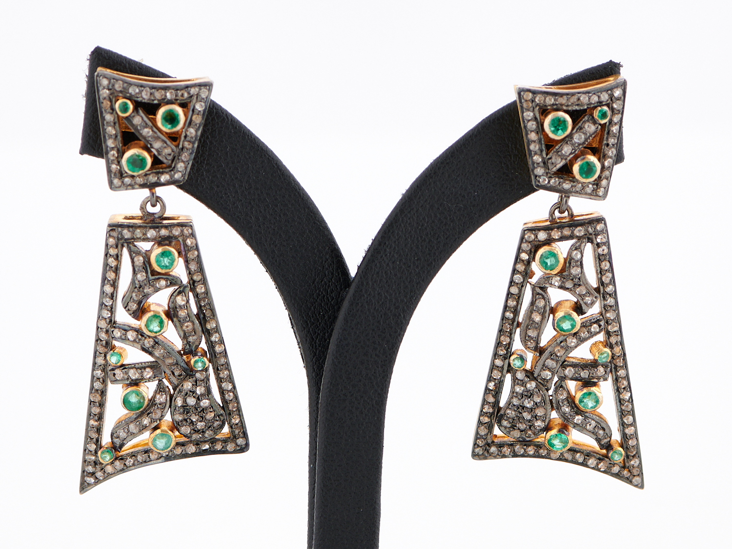 A PAIR OF DIAMOND AND EMERALD EARRINGS IN SILVER AND SILVER GILT, TO POST AND BUTTERFLY FITTINGS, LENGTH 55MM