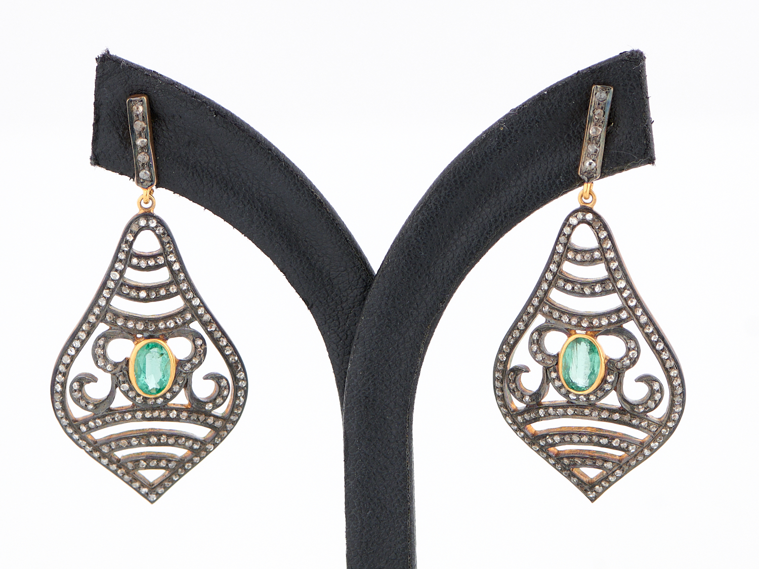 A PAIR OF DIAMOND AND EMERALD EARRINGS IN SILVER, DROP LENGTH 47MM, TO POST AND BUTTERFLY FITTINGS