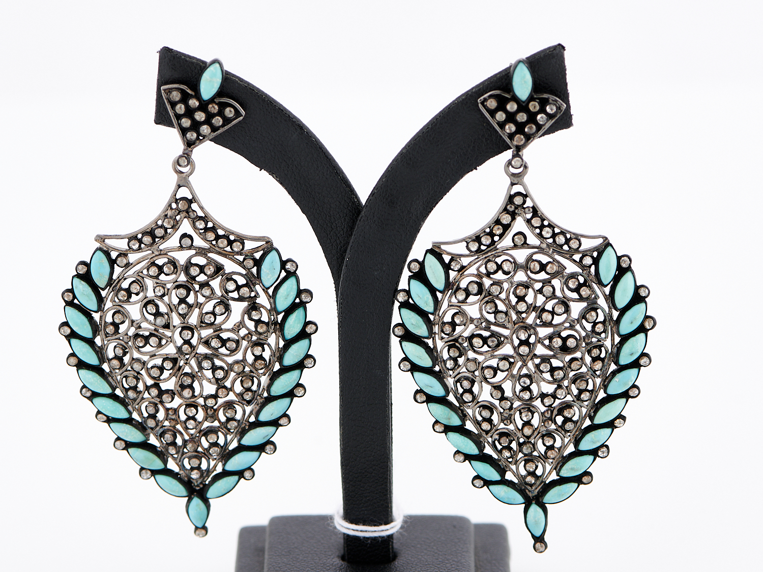 A PAIR OF TURQUOISE AND DIAMOND DROP EARRINGS IN OXIDISED SILVER, TO POST AND BUTTERFLY FITTINGS, DROP LENGTH 75MM,