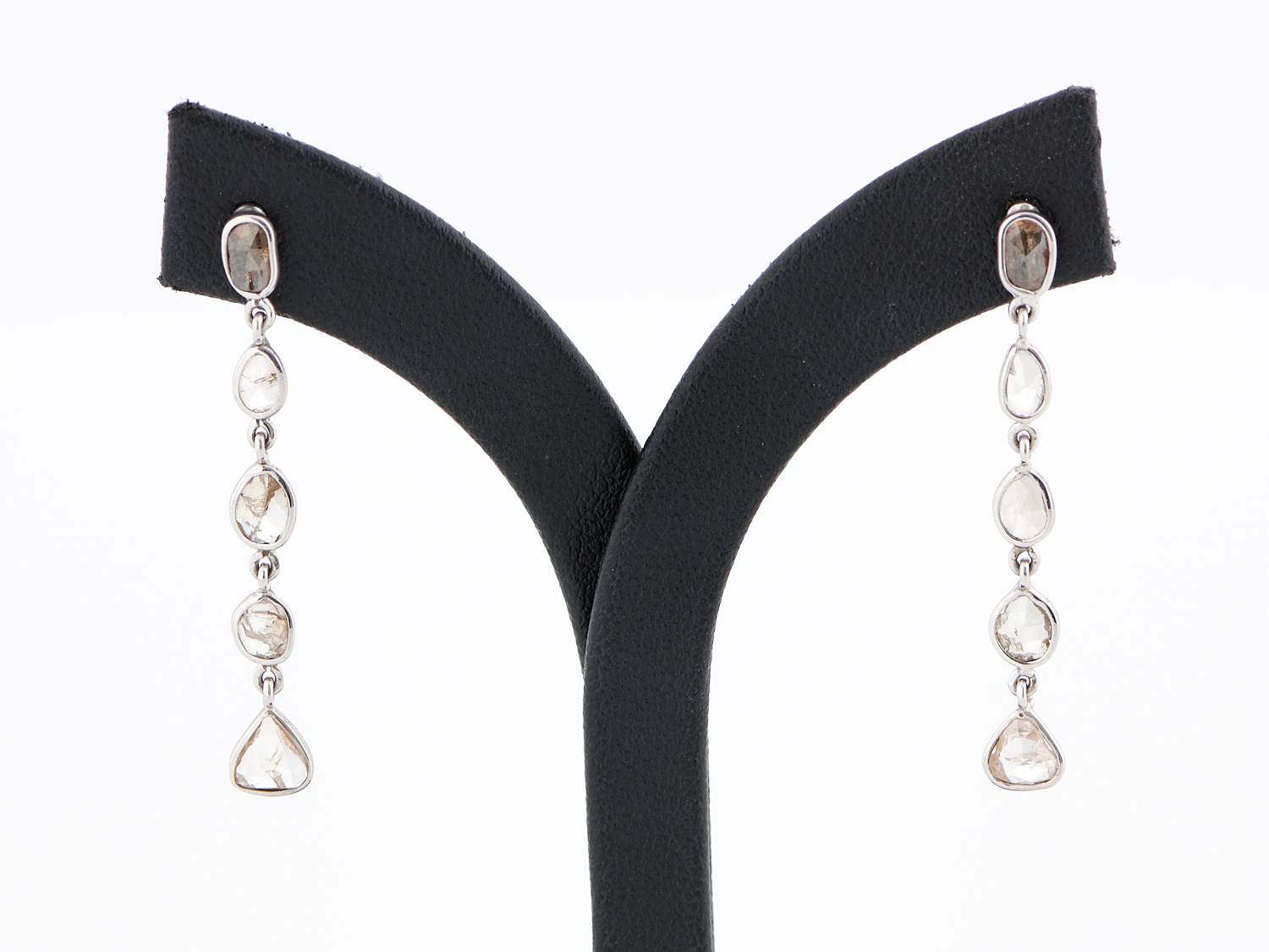 A PAIR OF ROSE CUT DIAMOND PENDANT EARRINGS IN 9CT WHITE GOLD, TO POST AND BUTTERFLY FITTINGS, LENGTH 37MM