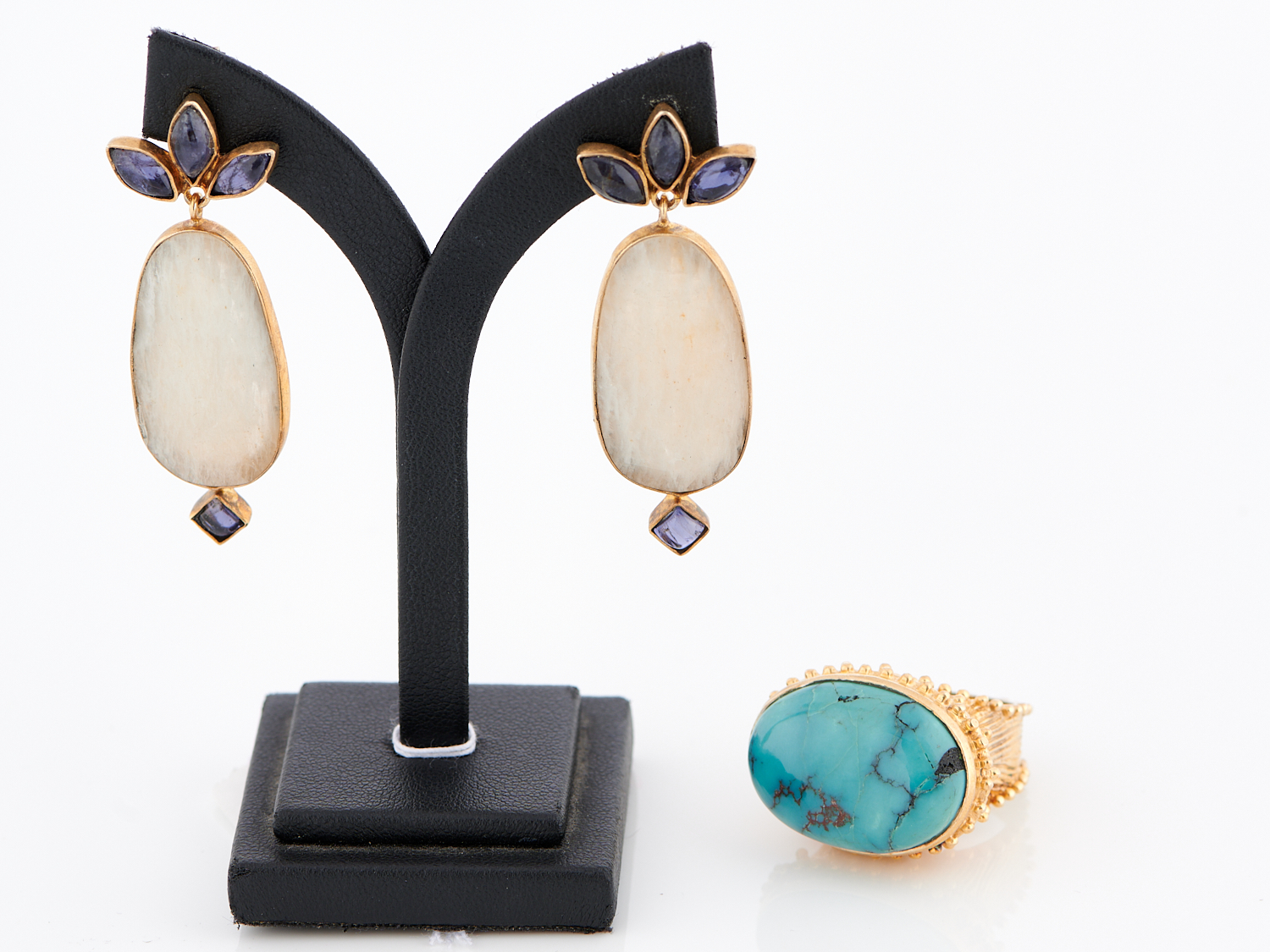 A PAIR OF WHITE SAPPHIRE AND IOLITE EARRINGS AND A TURQUOISE RING IN GOLD PLATED STERLING SILVER, EARRINGS TO POST AND BUTTERFLY FITTINGS