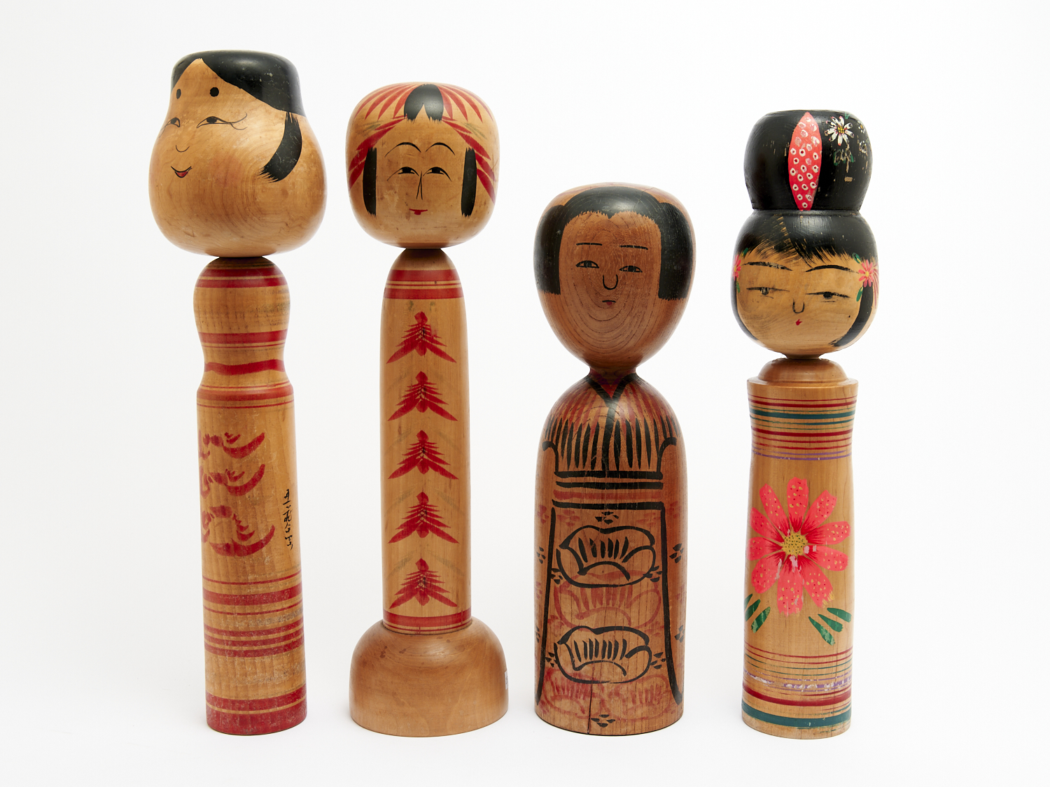 FOUR UNUSUAL SHAPED HANDPAINTED CARVED WOODEN JAPANESE KOKESHI DOLLS, H.45CM (TALLEST), LEONARD JOEL LOCAL DELIVERY: MEDIUM