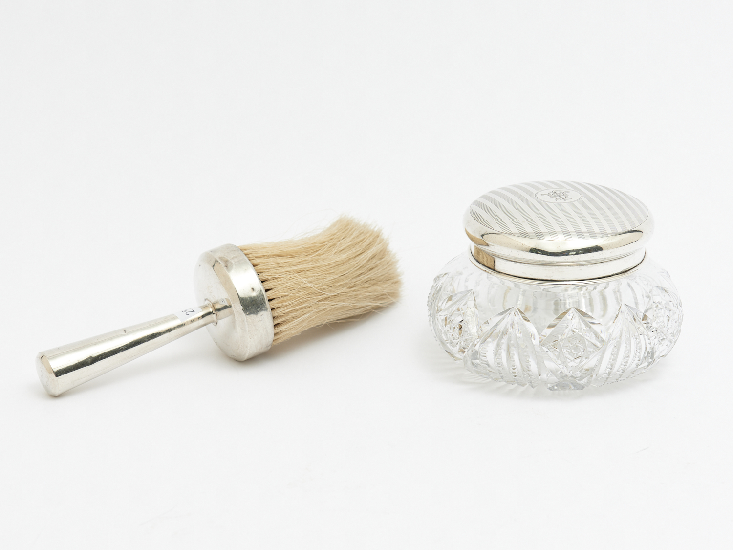 TWO STERLING SILVER ITEMS INCLUDING HAT BRUSH AND LIDDED CRYSTAL CONTAINER (A/F), LEONARD JOEL LOCAL DELIVERY: SMALL