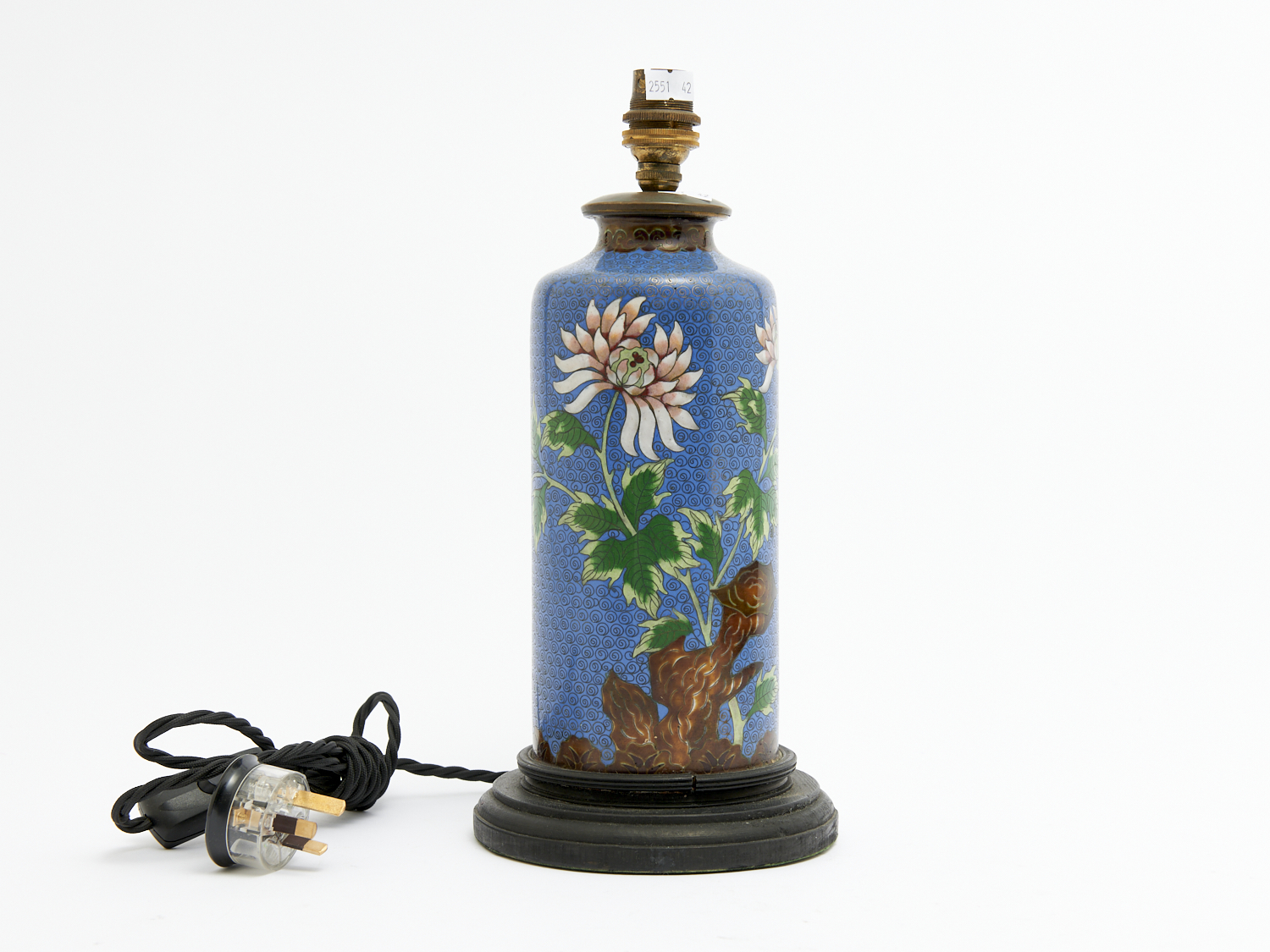 A CHINESE CLOISONNE FLOWER DECORATED LAMP BASE ON WOODEN STAND, H.32CM, LEONARD JOEL LOCAL DELIVERY: MEDIUM