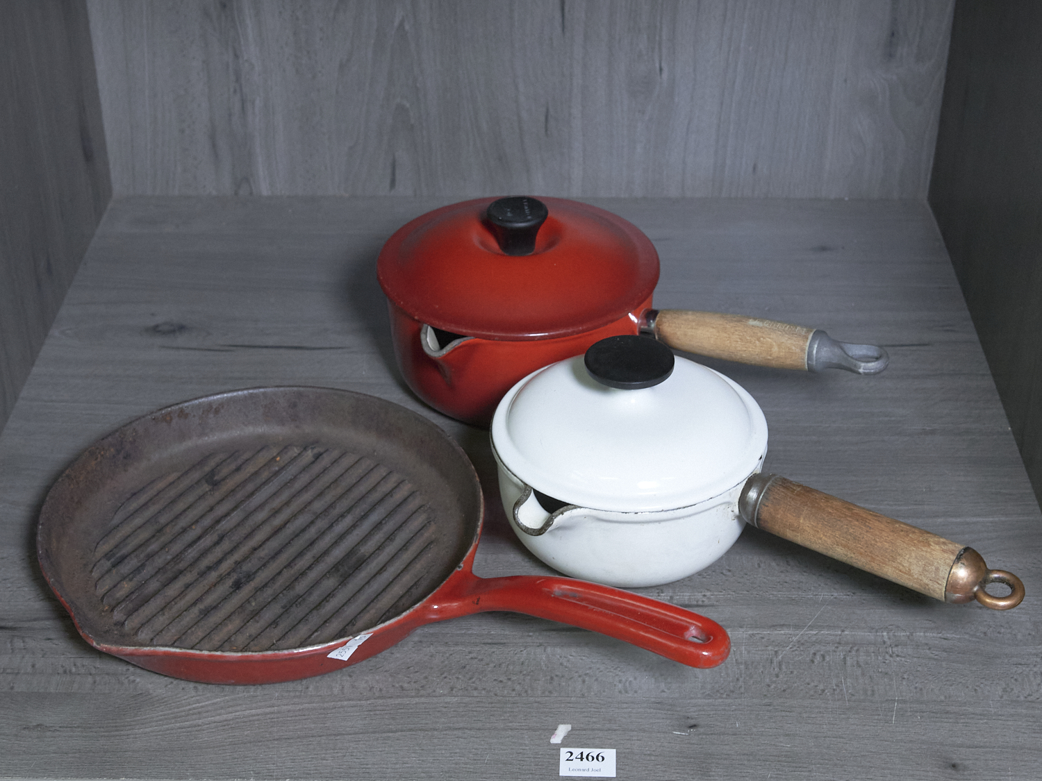 THREE FRENCH CAST-IRON COOKING POTS INCLUDING TWO LE CREUSET LIDDED SAUCEPANS W.22.5CM (LARGEST), LEONARD JOEL LOCAL DELIVERY: MEDIUM