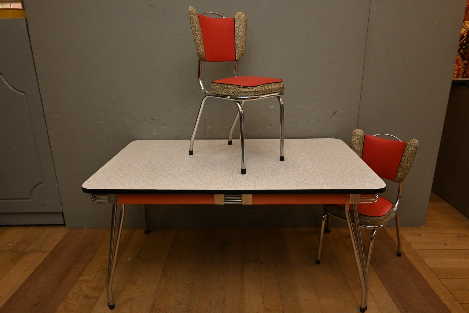 A 1950's CHROME AND LAMINEX DINER TABLE WITH TWO MATCHED CHAIRS (A/F) ( 75H X 152W X 91D CM)(LEONARD JOEL DELIVERY SIZE: X-LARGE)