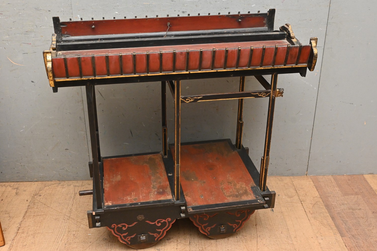 A 19TH CENTURY JAPANESE LACQUERED AND GILT WOOD FLOWER SELLERS STAND ON WHEELS (A/F) (89H X 90W X 50D CM) (LEONARD JOEL DELIVERY SIZE: LARGE)