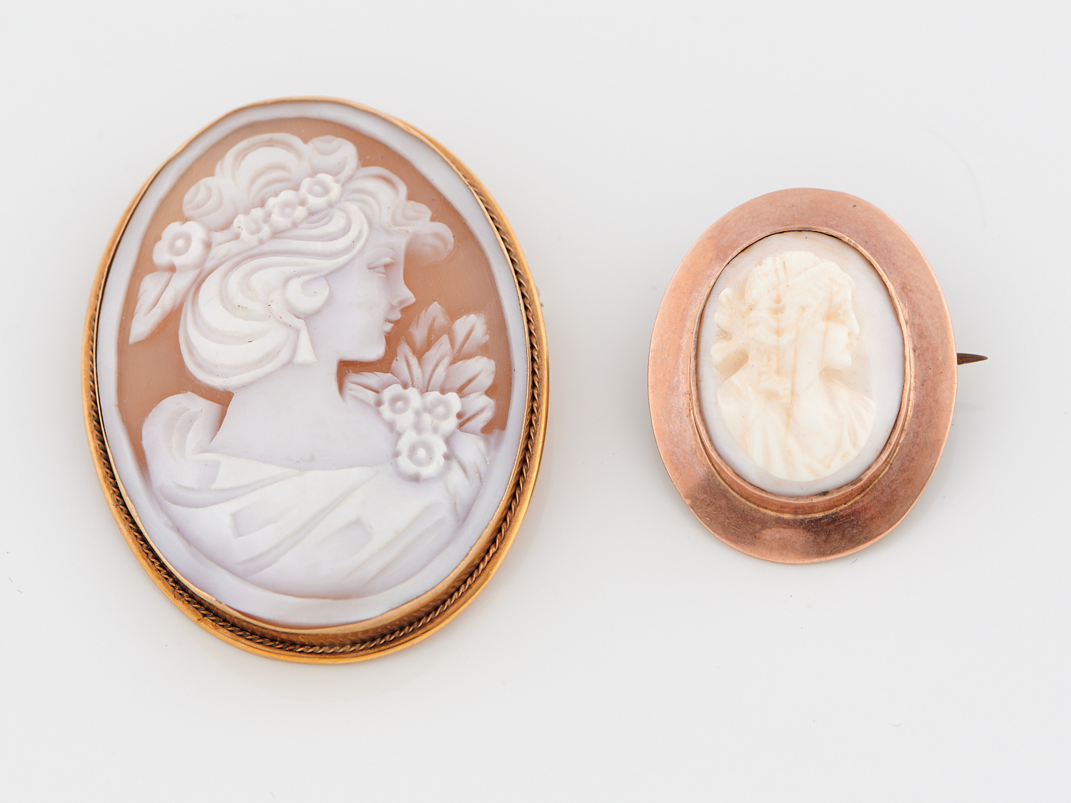 AN ANTIQUE AUSTRALIAN CAMEO IN 9CT GOLD BY WILLIS, TOGETHER WITH A VINTAGE CAMEO IN 9CT GOLD