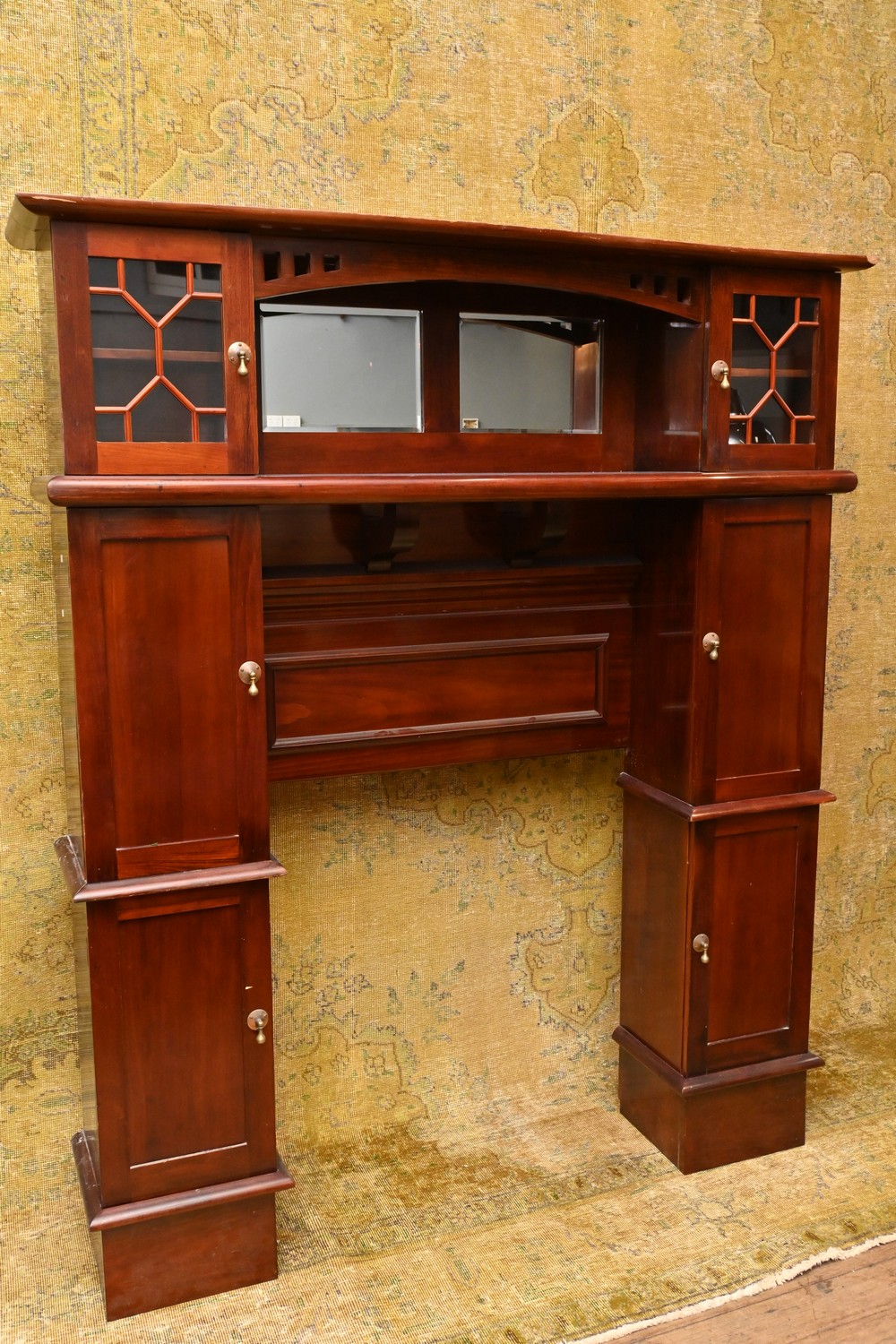 AN ARTS & CRAFTS MAHOGANY FIREPLACE MANTLEPIECE (A/F) (187H X 158W X 34D CM) (PLEASE NOTE THIS HEAVY ITEM MUST BE REMOVED BY CARRIERS AT THE CUSTOMER'S EXPENSE. LEONARD JOEL STAFF CANNOT ASSIST CARRYING THIS ITEM) (X-LARGE ITEM)