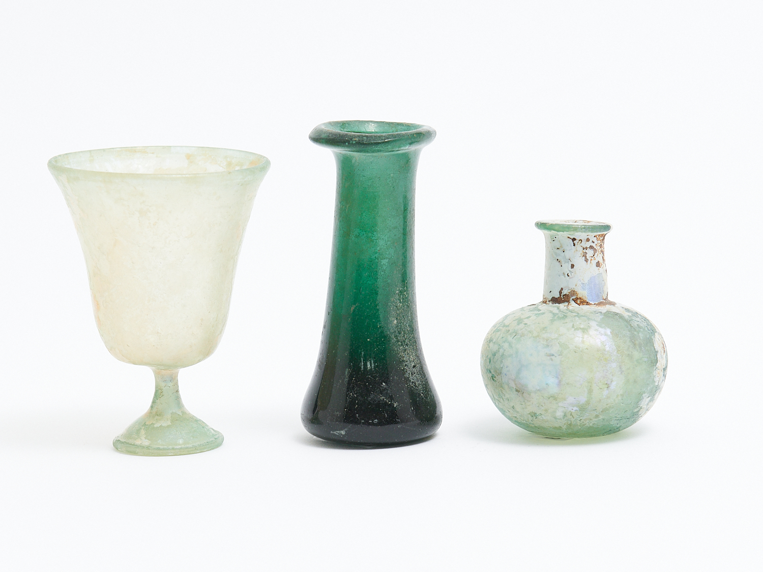 THREE PIECES OF ROMAN GLASS INCLUDING A FOOTED CUP H.8.5CM, LEONARD JOEL LOCAL DELIVERY: SMALL