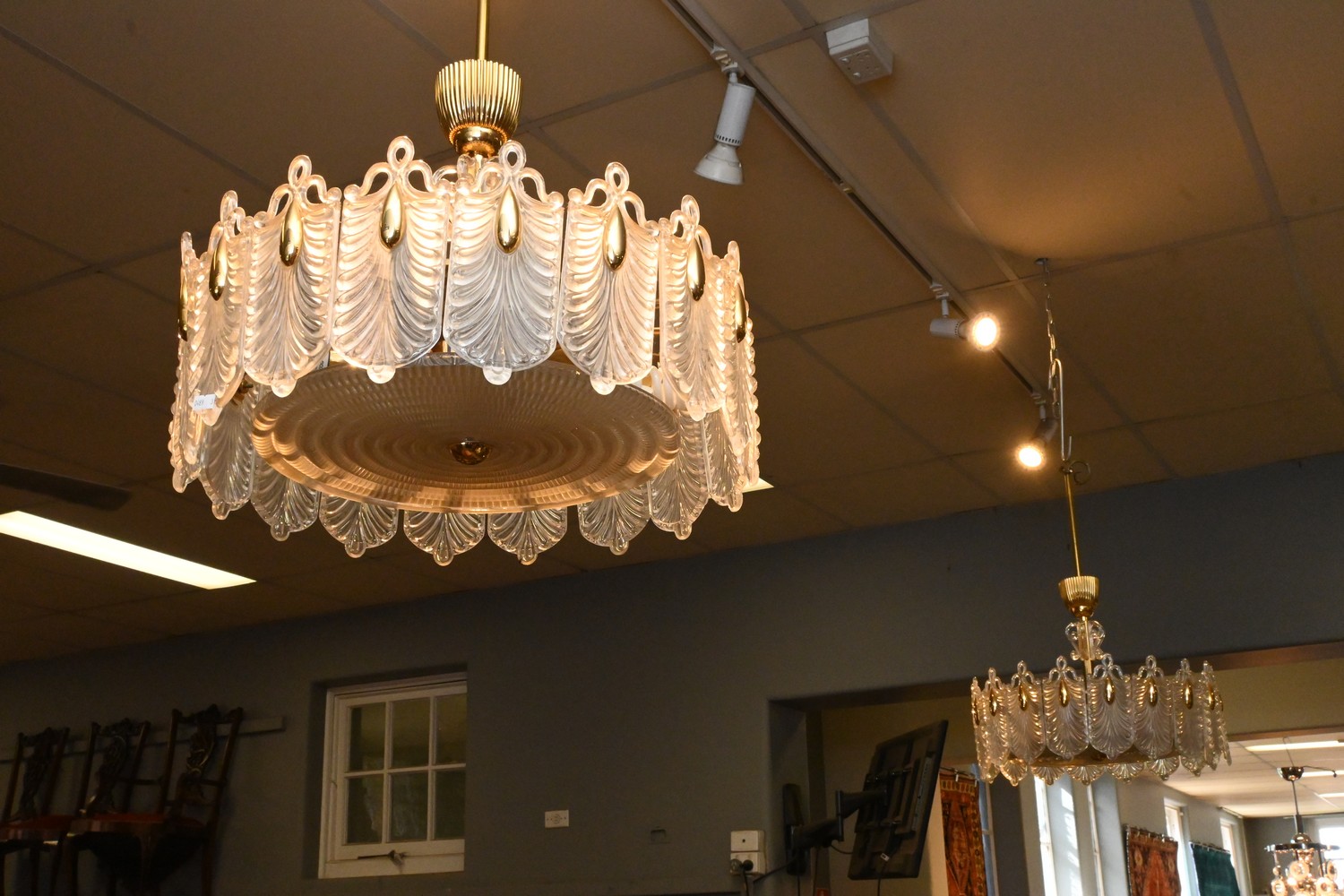 A PAIR OF MID-CENTURY KAISER DORIA LEUCHTEN GERMAN GLASS AND BRASS CHANDELIERS (H60 X D48 CM) (PLEASE NOTE THIS HEAVY ITEM MUST BE REMOVED BY CARRIERS AT THE CUSTOMER'S EXPENSE. LEONARD JOEL STAFF CANNOT ASSIST CARRYING THIS ITEM) (X-LARGE ITEM)