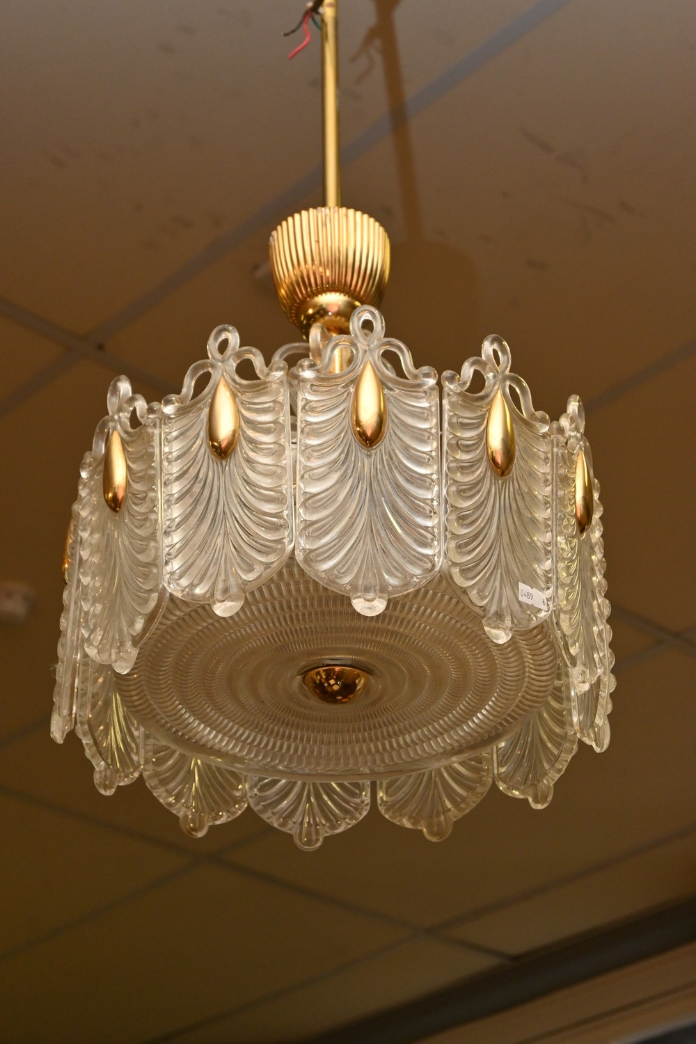 A MID CENTURY KAISER DORIA LEUCHTEN GERMAN GLASS AND BRASS CHANDELIER (H70 X D30 CM) (PLEASE NOTE THIS HEAVY ITEM MUST BE REMOVED BY CARRIERS AT THE CUSTOMER'S EXPENSE. LEONARD JOEL STAFF CANNOT ASSIST CARRYING THIS ITEM) (X-LARGE ITEM)