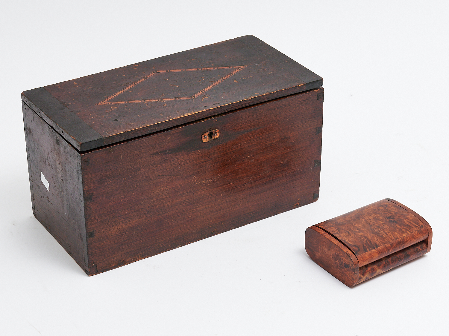 A TIMBER BOX TOGETHER WITH A SMALL WALNUT BOX H.16.5CM X W.30CM X D.15.5CM (LARGEST), LEONARD JOEL LOCAL DELIVERY: MEDIUM