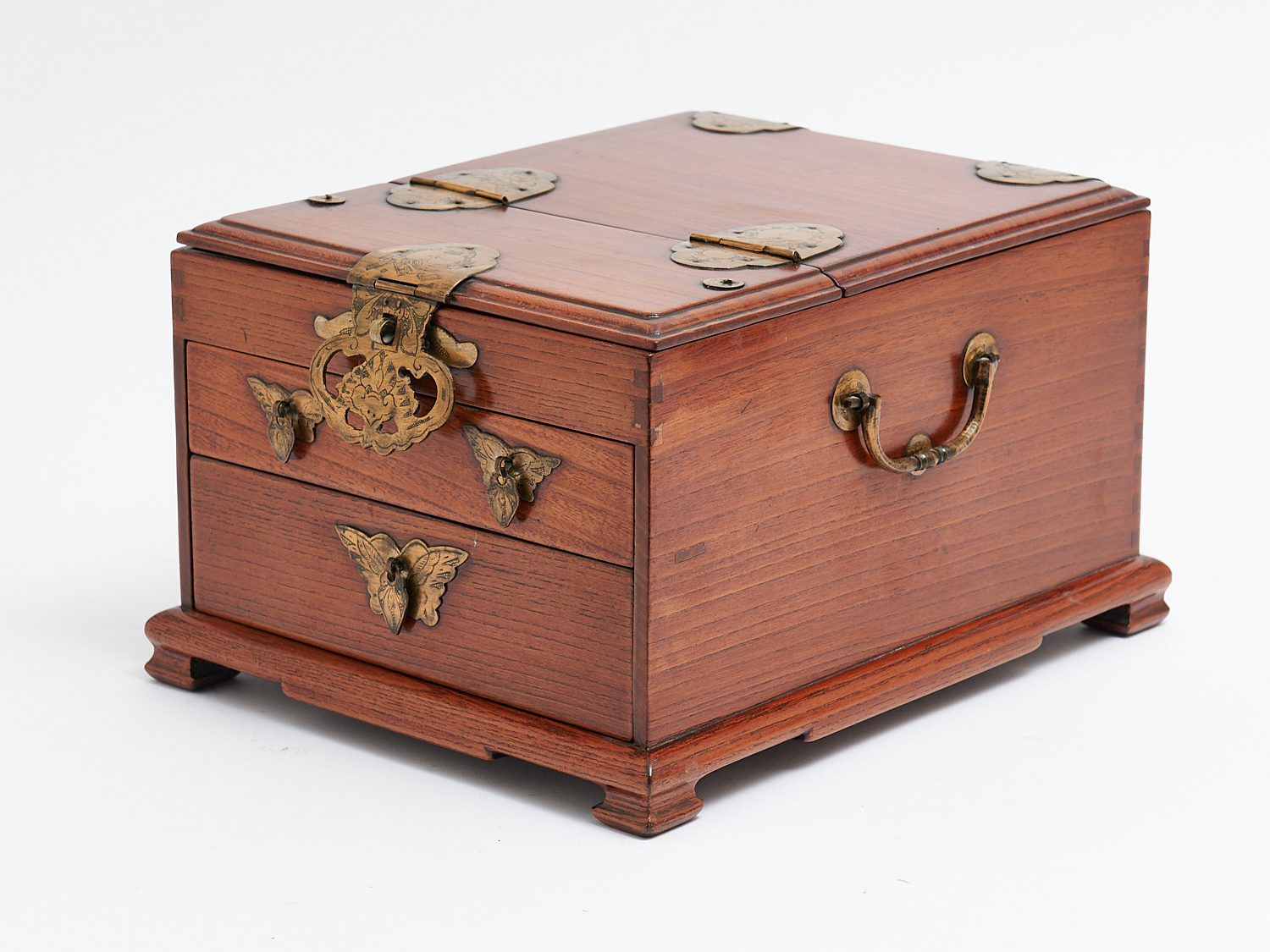 A CHINESE WOODEN VANITY JEWELLERY BOX H.17.5CM X W.25CM X D.31CM (A/F), LEONARD JOEL LOCAL DELIVERY: MEDIUM