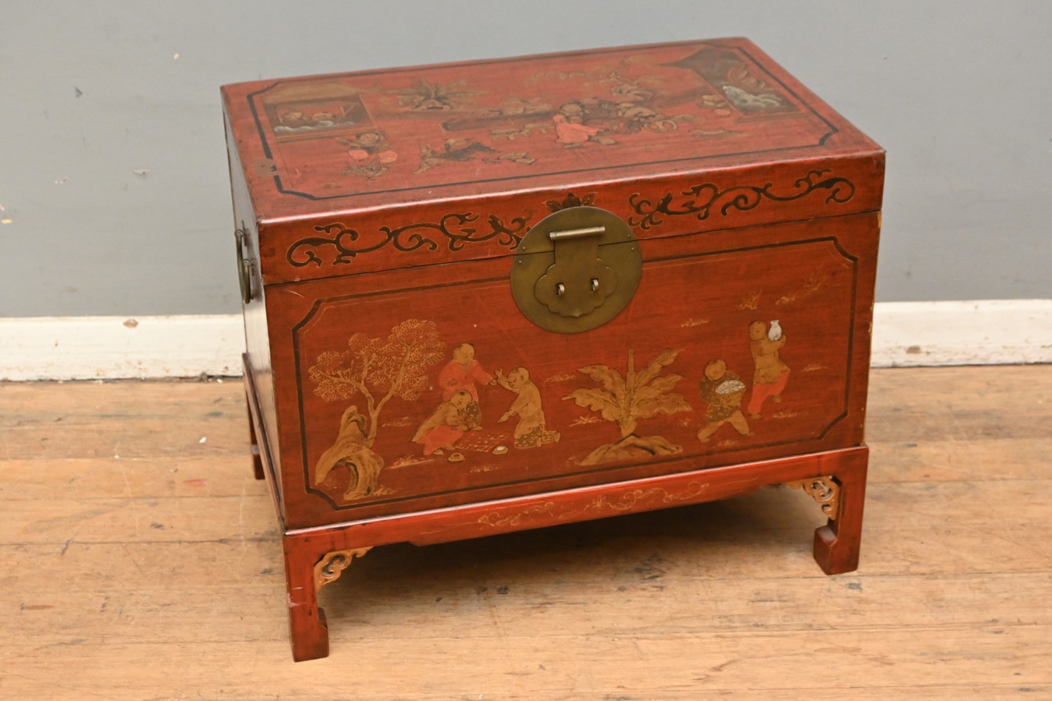 A CHINESE RED LAQUERED FLIP TOP CHEST (A/F) (60H X 72W X 48D CM) (LEONARD JOEL DELIVERY SIZE: LARGE)