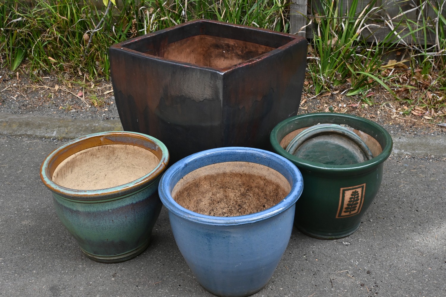 A COLLECTION OF FOUR GLAZED POTS (A/F) (H88 X W67 X D64 CM) (PLEASE NOTE THIS HEAVY ITEM MUST BE REMOVED BY CARRIERS AT THE CUSTOMER'S EXPENSE. LEONARD JOEL STAFF CANNOT ASSIST CARRYING THIS ITEM) (X-LARGE ITEM)