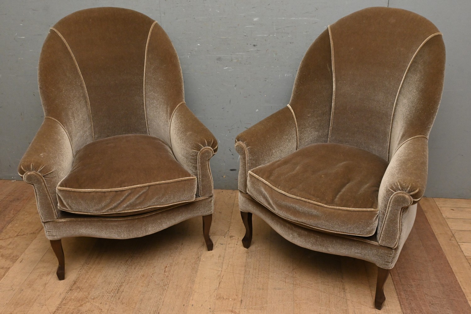 A PAIR OF ART DECO UPHOLSTERED TUB CHAIRS (105H X 81W X 70D CM) (PLEASE NOTE THIS HEAVY ITEM MUST BE REMOVED BY CARRIERS AT THE CUSTOMER'S EXPENSE. LEONARD JOEL STAFF CANNOT ASSIST CARRYING THIS ITEM) (X-LARGE ITEM)