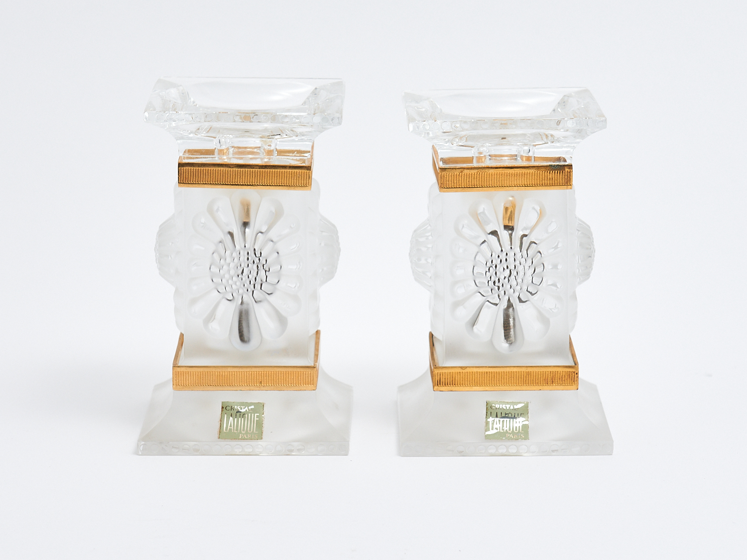 A PAIR OF LALIQUE 'PARQUETTE' MOULDED CRYSTAL CANDLESTICKS H.13CM, LEONARD JOEL LOCAL DELIVERY: SMALL
