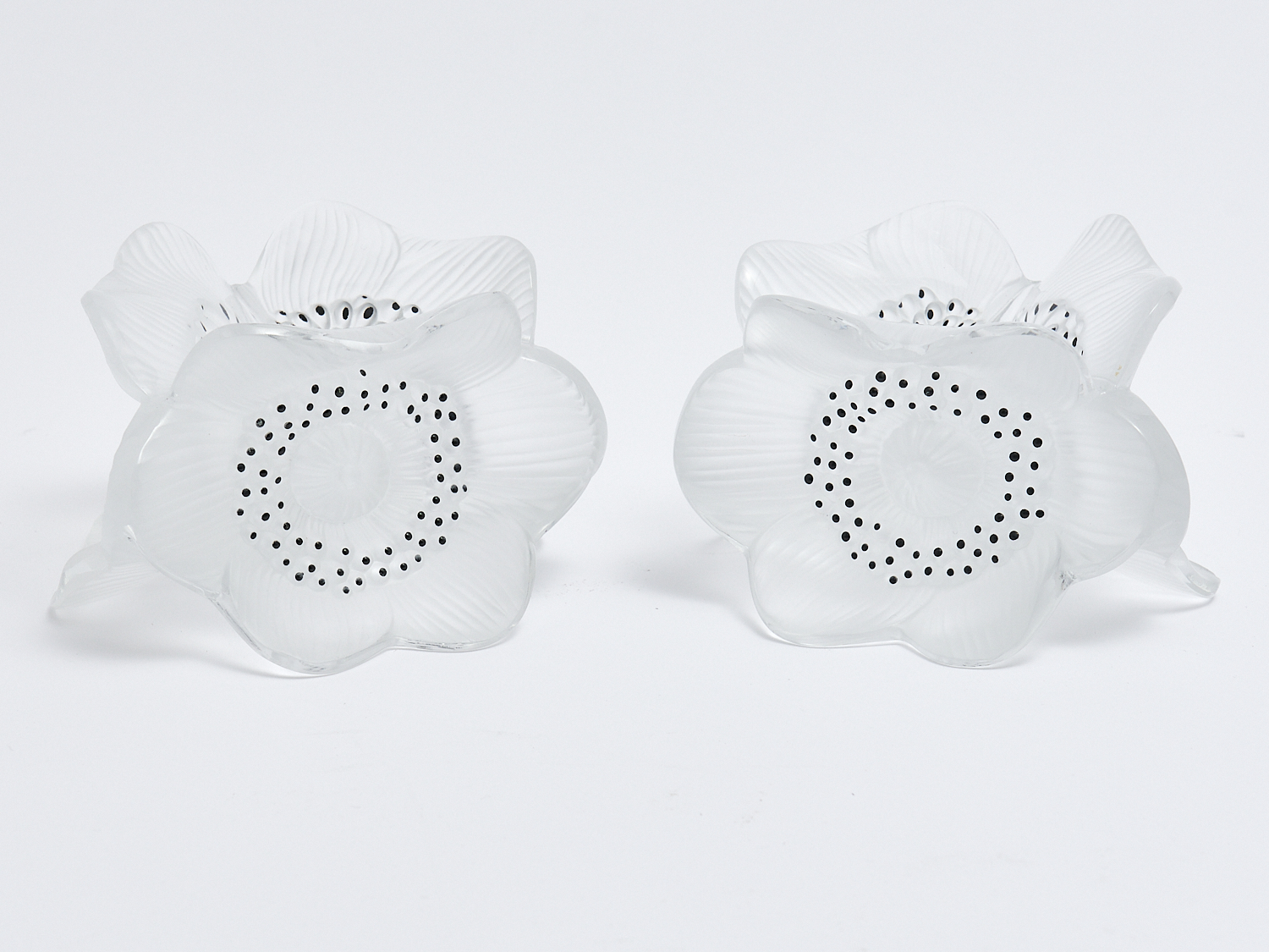 A PAIR OF LALIQUE 'ANEMONE' MOULDED CRYSTAL DWARF CANDLESTICKS H.7.5CM, LEONARD JOEL LOCAL DELIVERY: SMALL