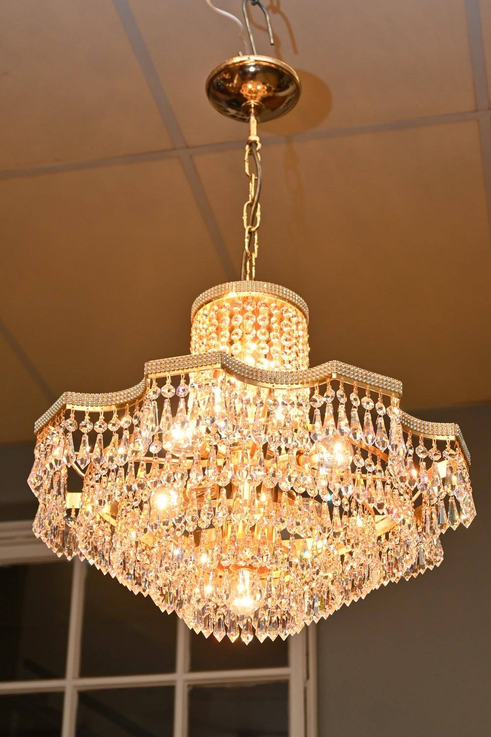 A 1970'S SWAROVSKI CRYSTAL FIVE TIERED BULLET DROPLET CHANDELIER (H80 X D50 CM) (PLEASE NOTE THIS HEAVY ITEM MUST BE REMOVED BY CARRIERS AT THE CUSTOMER'S EXPENSE. LEONARD JOEL STAFF CANNOT ASSIST CARRYING THIS ITEM) (X-LARGE ITEM)