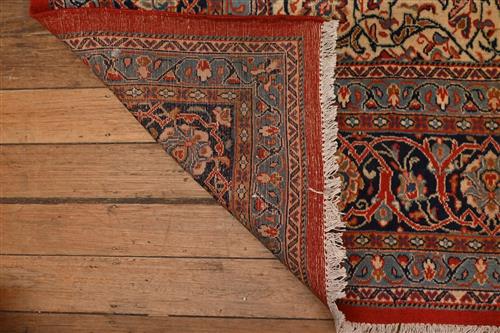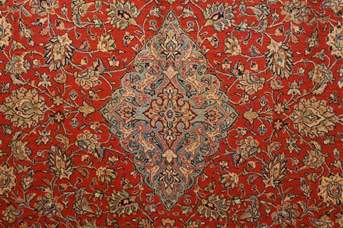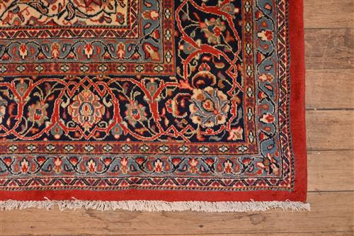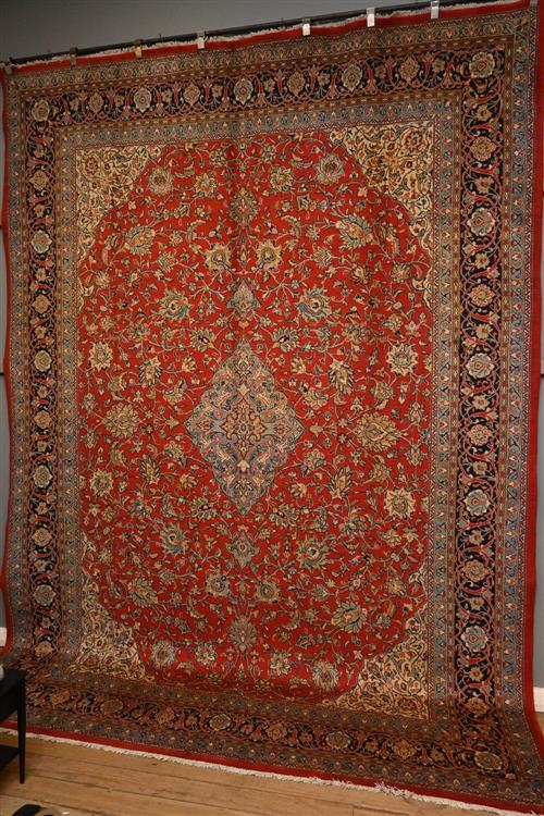SUPERB & PRISTINE ROYAL SAROUK PERSIAN CARPET VERY FINELY HANDKNOTTED WITH FINEST WOOLEN WITH A DENSE AND HARDWEARING PILE COMPRISING OF LARGE ROSSETS SURROUNDING A FRENCH BLUE TONED MEDALLION ON A TUSCAN TERRECOTA GROUND COLOUR FRAMED WITH DEEP PERSIAN INDIGO BLUE WITH CHAMPAIGN AND GREEN TONES. SIZE: 380 X 275CM ORIGIN: IRAN - RRP: $7,900 DOCUMENTATION OF AUTHENTICITY INCLUDED.