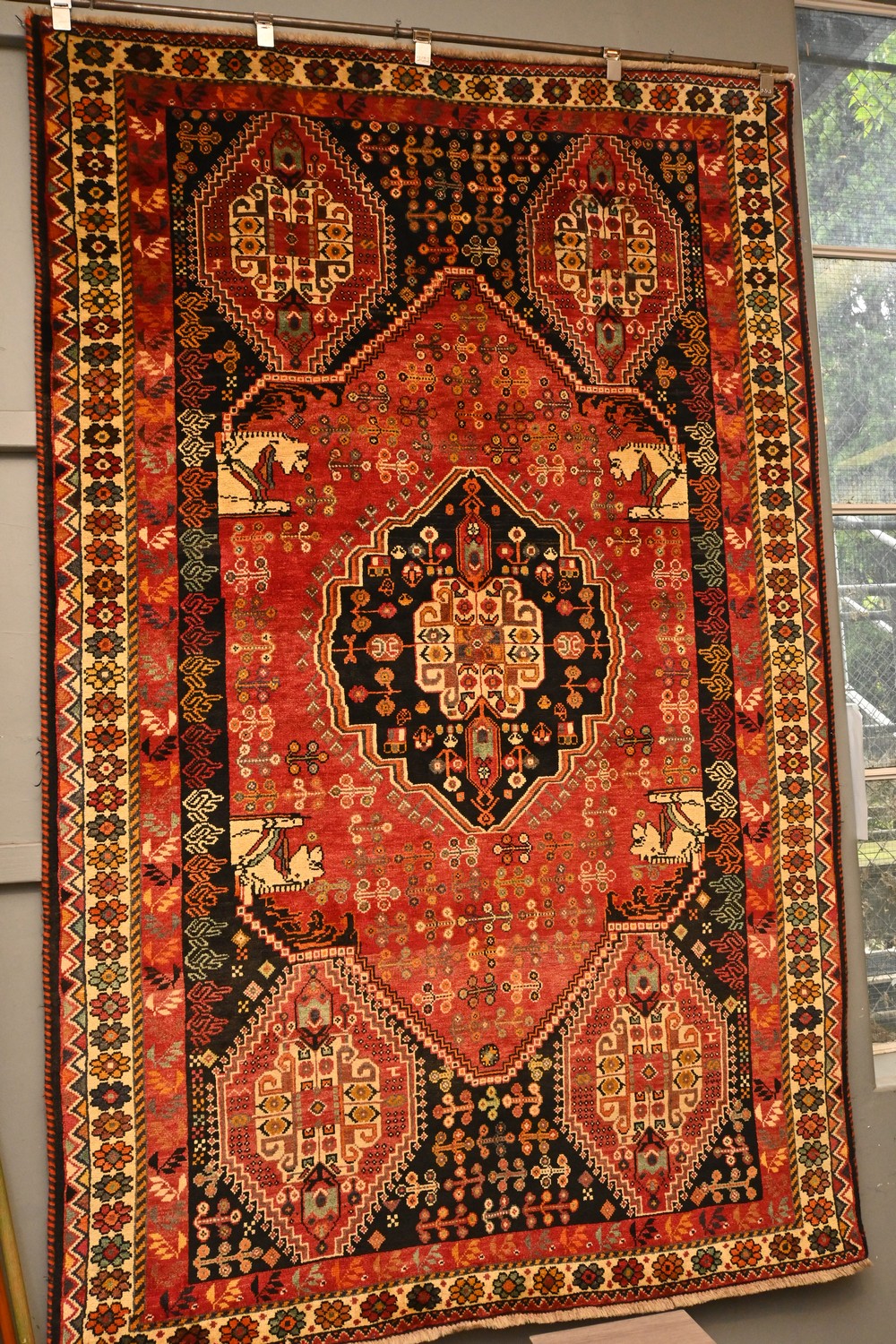 VERY FINE PERSIAN SOLID QASHGAIE RUG 100% VEGETABLE DYES WITH HAND SPUN WOOL PILE. FEATURING STATUES OF HORSES FROM THE ENTRANCE TO THE ANCIENT CITY OF PERSOPOLIS WITH A RICH CRIMSON FIELD. ALSO COMPRISING OF A LARGE PERSIAN BLUE MEDALLION SURROUNDED WITH SHRUB FLORAL MOTIFS. EX-GALLERY RUG IN PRISTINE CONDITION AND HIGHLY RECOMMENDED FOR HEAVY TRAFFIC AREAS. SIZE: 254 X 164 CM ORIGIN: PERSIA - RRP: $3,800 DOCUMENTATION OF AUTHENTICITY INCLUDED.