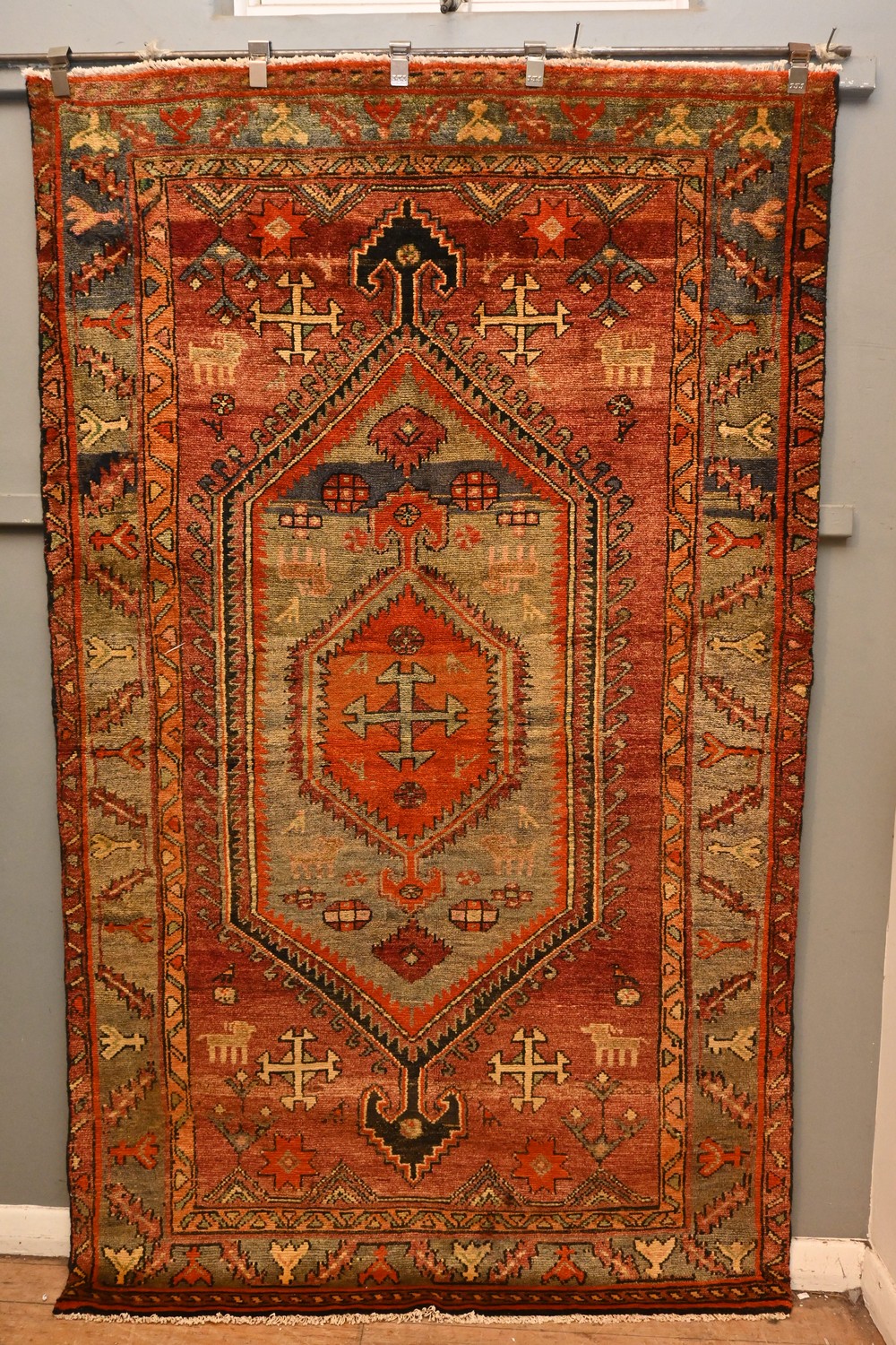 MOST COLOUR FULL PERSIAN KHAMSE RUG WITH UNUSUAL COLOUR TONES 100% NATURAL DYES & WOOLEN PILE WITH DENSE WEAVE FEATURING A DIAMOND DOUBLE ANCHOR MEDALLION SURROUNDED WITH DEERS, STARS AND CROSS MOTIFS THROUGHOUT. EX-GALLERY RUG IN SUPERB CONDITION. SIZE: 246 X 148 CM, ORIGIN: PERSIA - RRP: $2,900 DOCUMENTATION OF AUTHENTICITY INCLUDED.