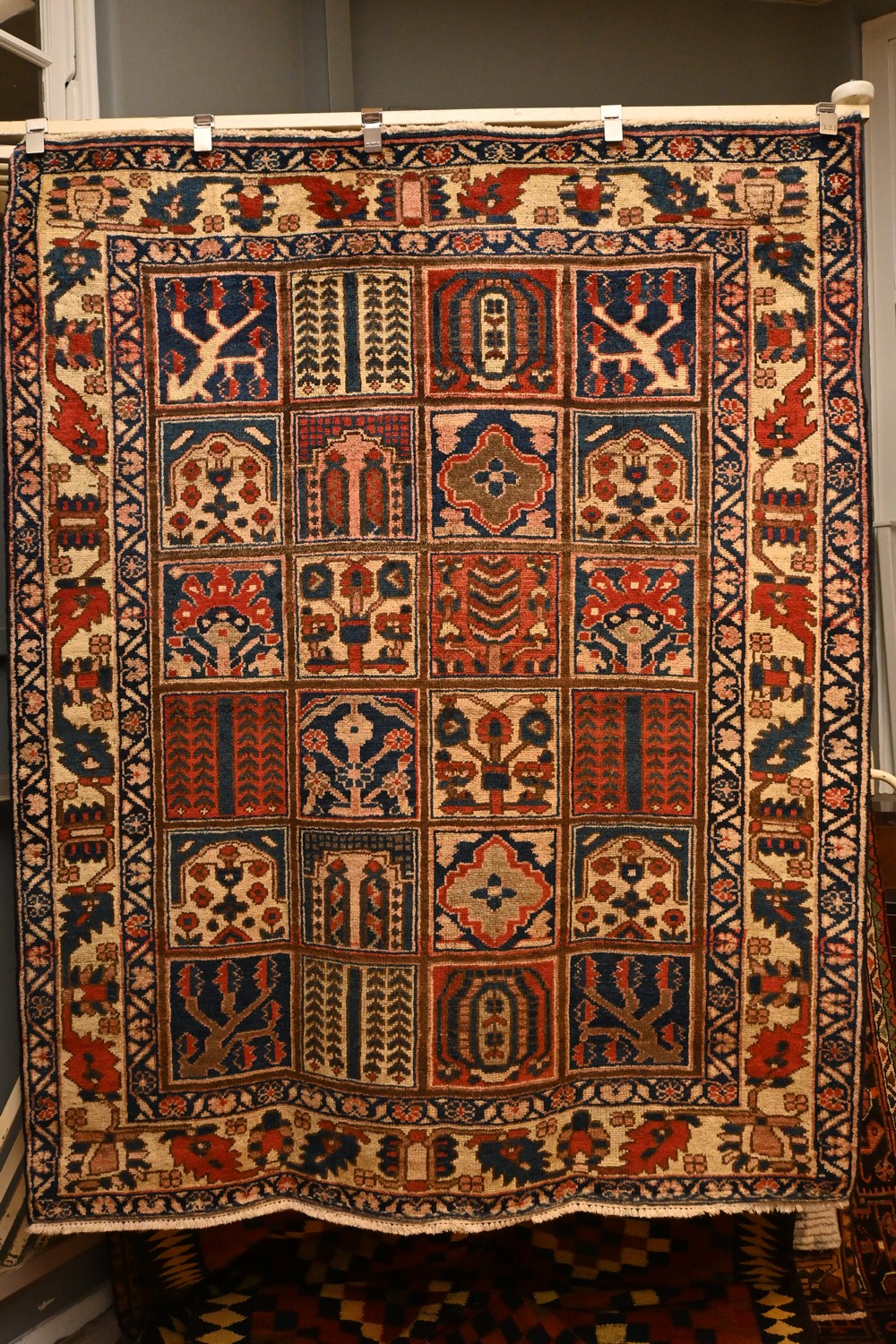 A PERSIAN TRIBAL BAKHTIARI GARDEN DESIGN RUG, HANDKNOTTED WITH 100% WOOLEN SEMI VINTAGE PILE, CIRCA 1970S FEATURING WILLOW AND PINE TREE MOTIFS WITH IN A TRADITIONAL PERSIAN GARDEN DESIGN SIZE: 200 X 160 CM ORIGIN: IRAN- RRP: $1400 DOCUMENTATION OF AUTHENTICITY INCLUDED.