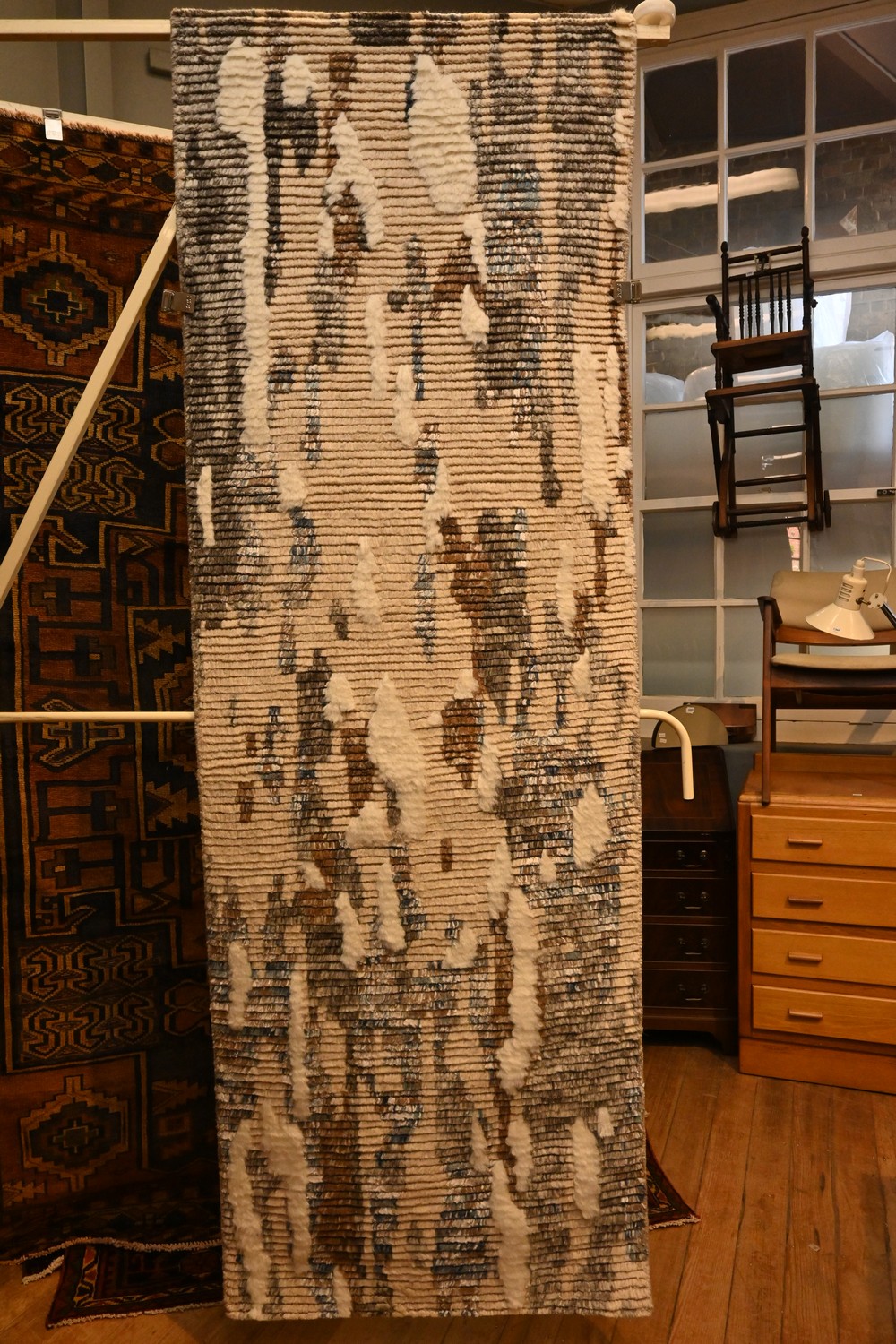 A MORROCON STYLE WOOLEN BERBER HALL RUNNER 100% WOOLEN PILE IN EARASE DESIGN IN TONES OF CREAM, BLUE AND MUSHROOM. SIZE: 301 X 83 CM ORIGIN: JAIPUR RRP: $900