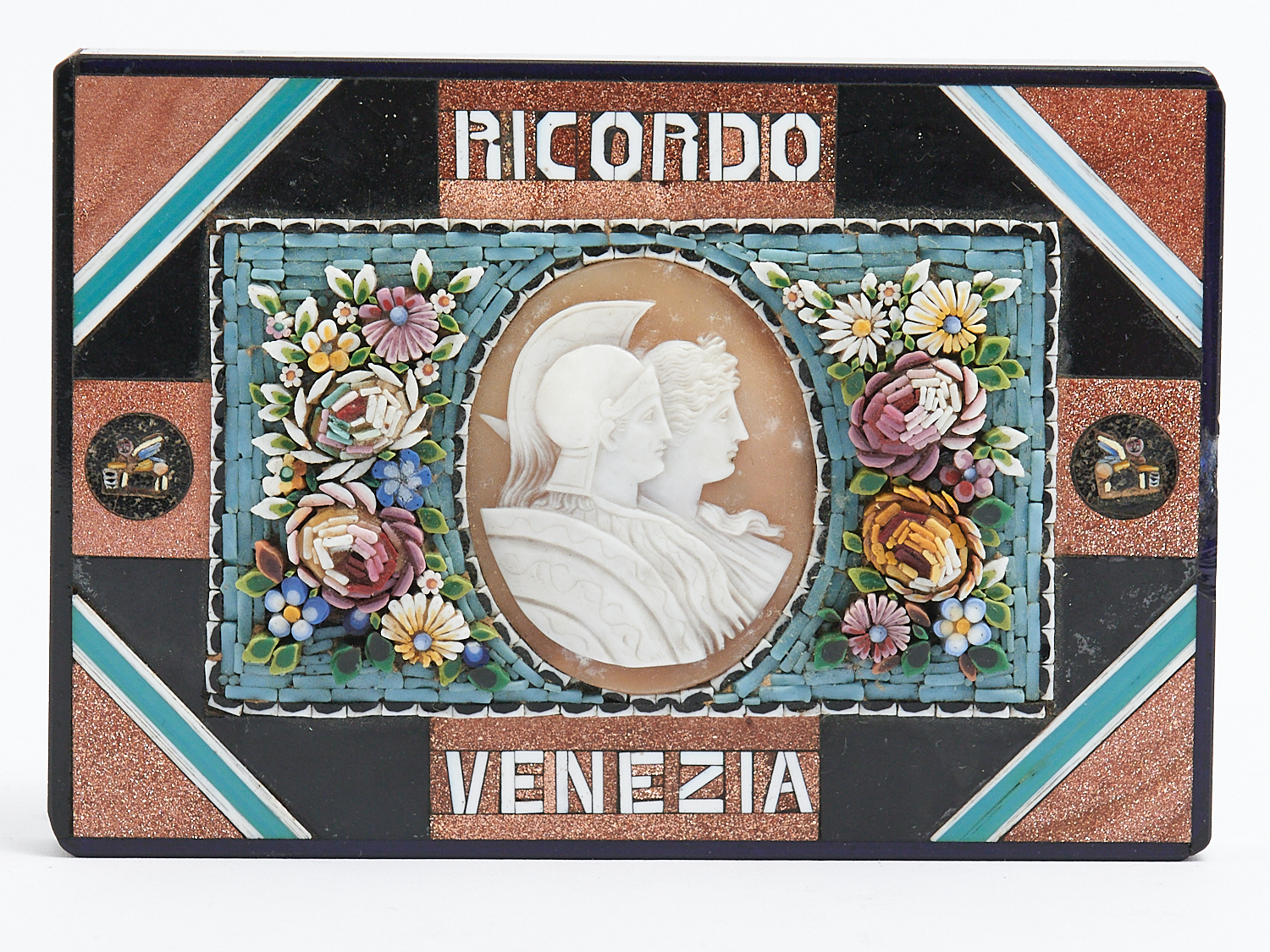 A MICROMOSAIC PLAQUE WITH CAMEO (A/F) W.12CM X D.8CM, LEONARD JOEL LOCAL DELIVERY: SMALL