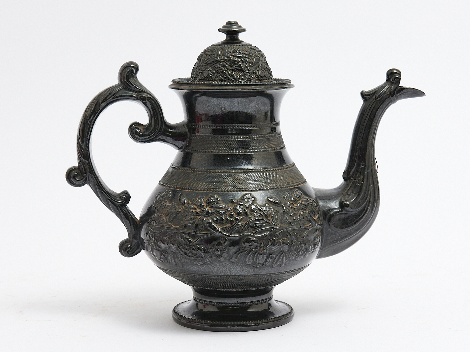 A BLACK POTTERY KETTLE (A/F) H.23.5CM, LEONARD JOEL LOCAL DELIVERY: SMALL