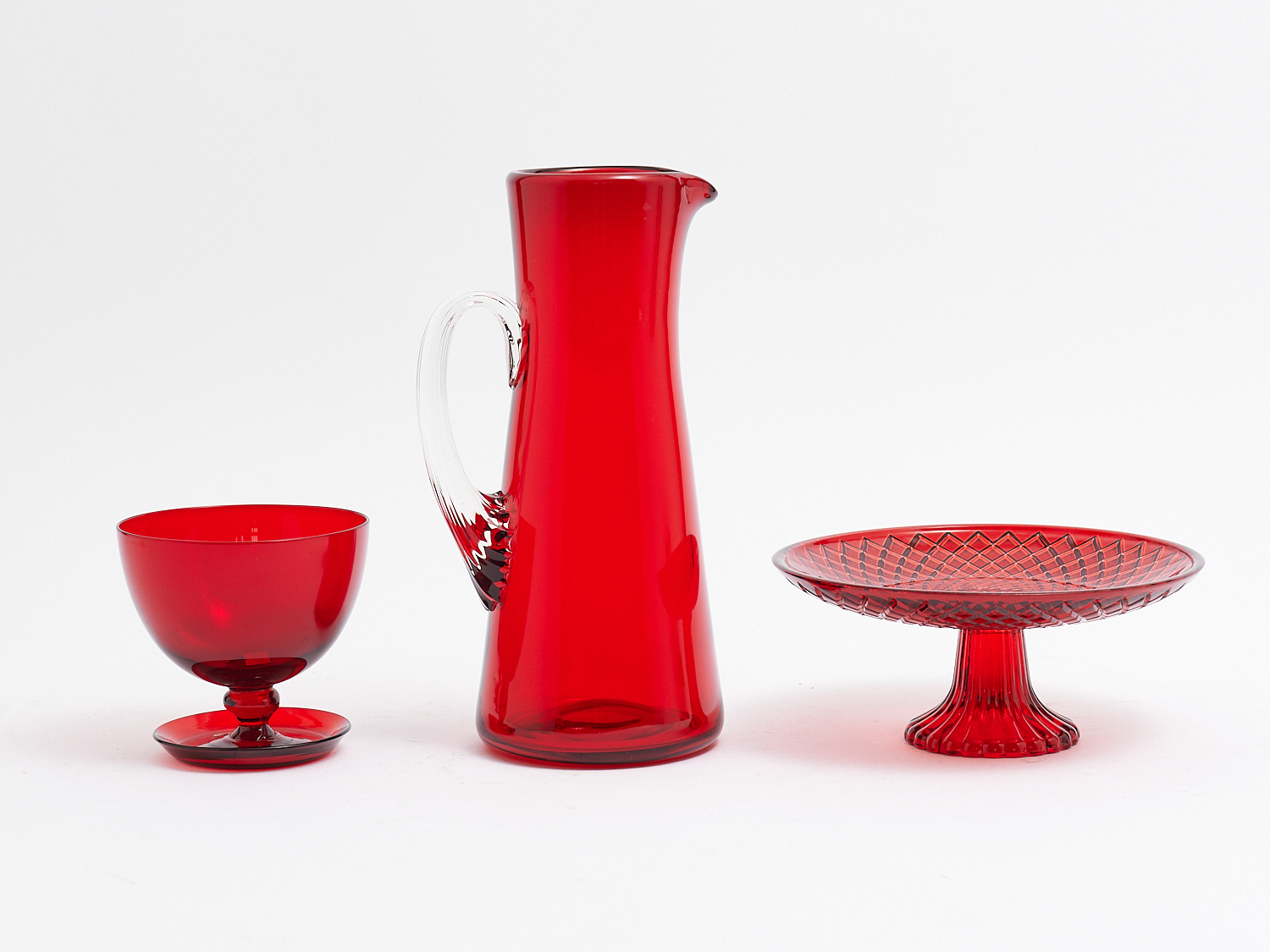 A TRIO OF VINTAGE RED GLASS PIECES INCLUDING AN ART GLASS JUG, A COMPORT AND A SWEDISH 'REIJMYRE' STEM BOWL H.26CM X W.11.5CM (LARGEST), LEONARD JOEL LOCAL DELIVERY: MEDIUM