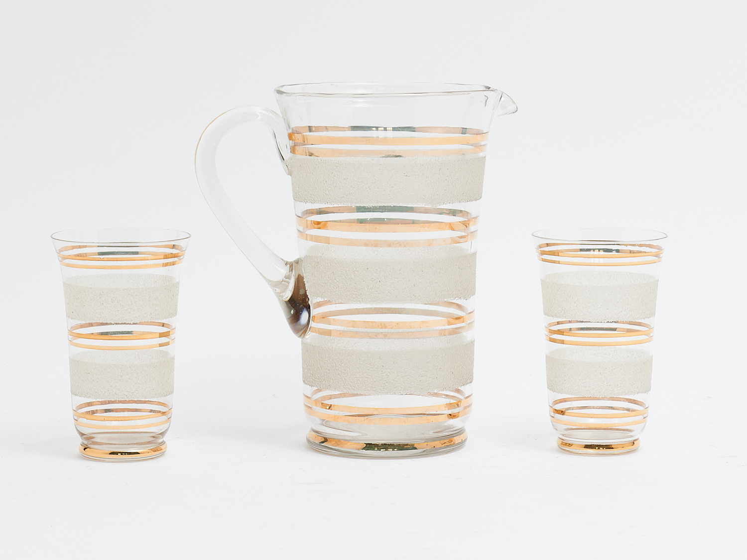 A VINTAGE LEMONADE JUG WITH FROSTED BANDS AND GOLD MOTIFS H.20CM (TALLEST), LEONARD JOEL LOCAL DELIVERY: MEDIUM